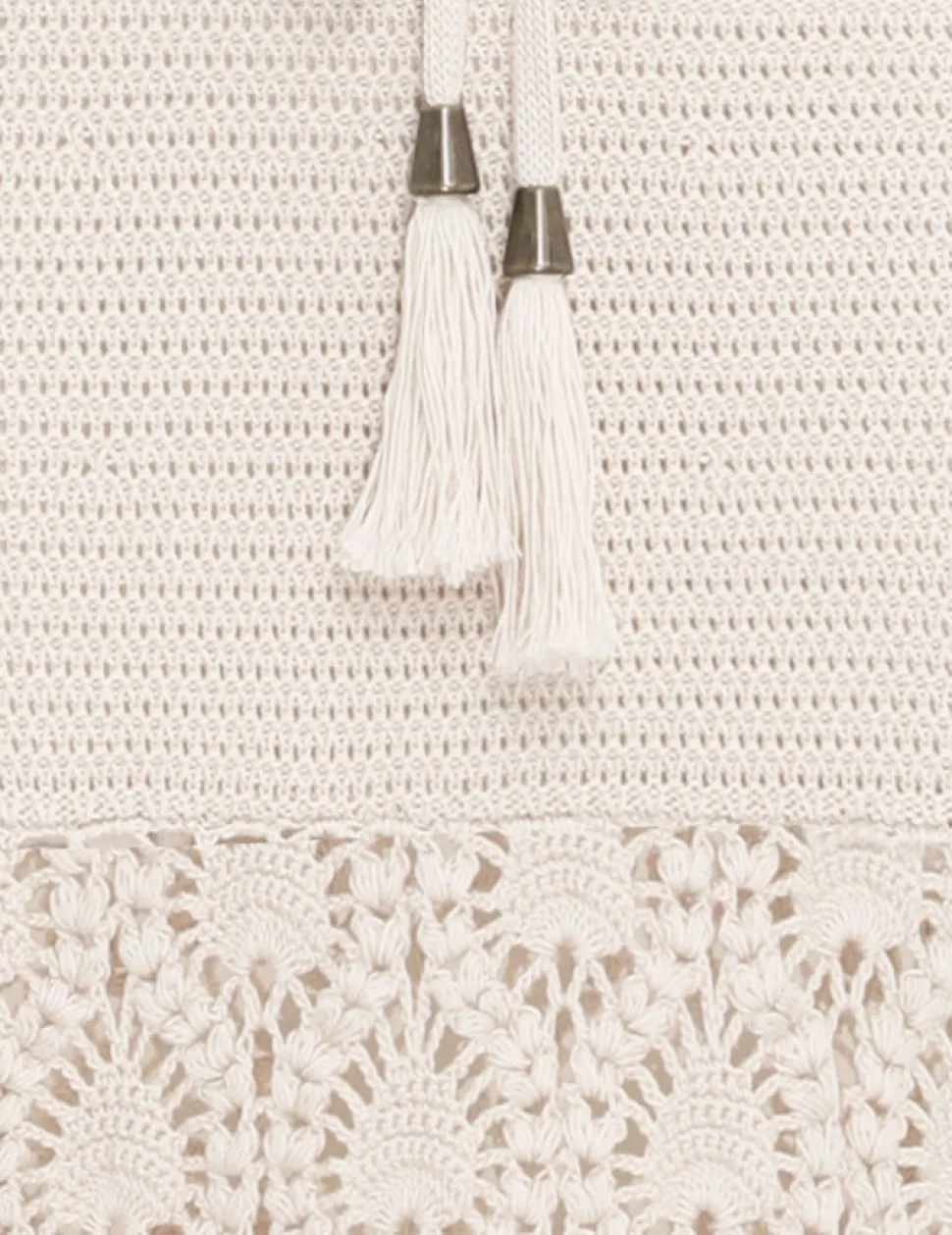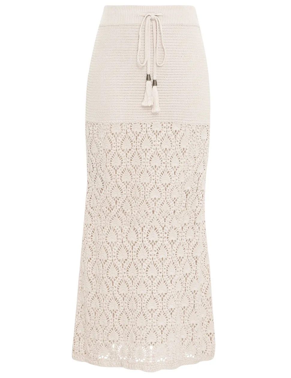 The Ginger Hand Crochet Midi Skirt In Cream From Our Summer Swim 2023 Collection. A Hand Crochet Midi Skirt Featuring A Ribbed Drawstring Waist.- Hand Crochet Midi Skirt