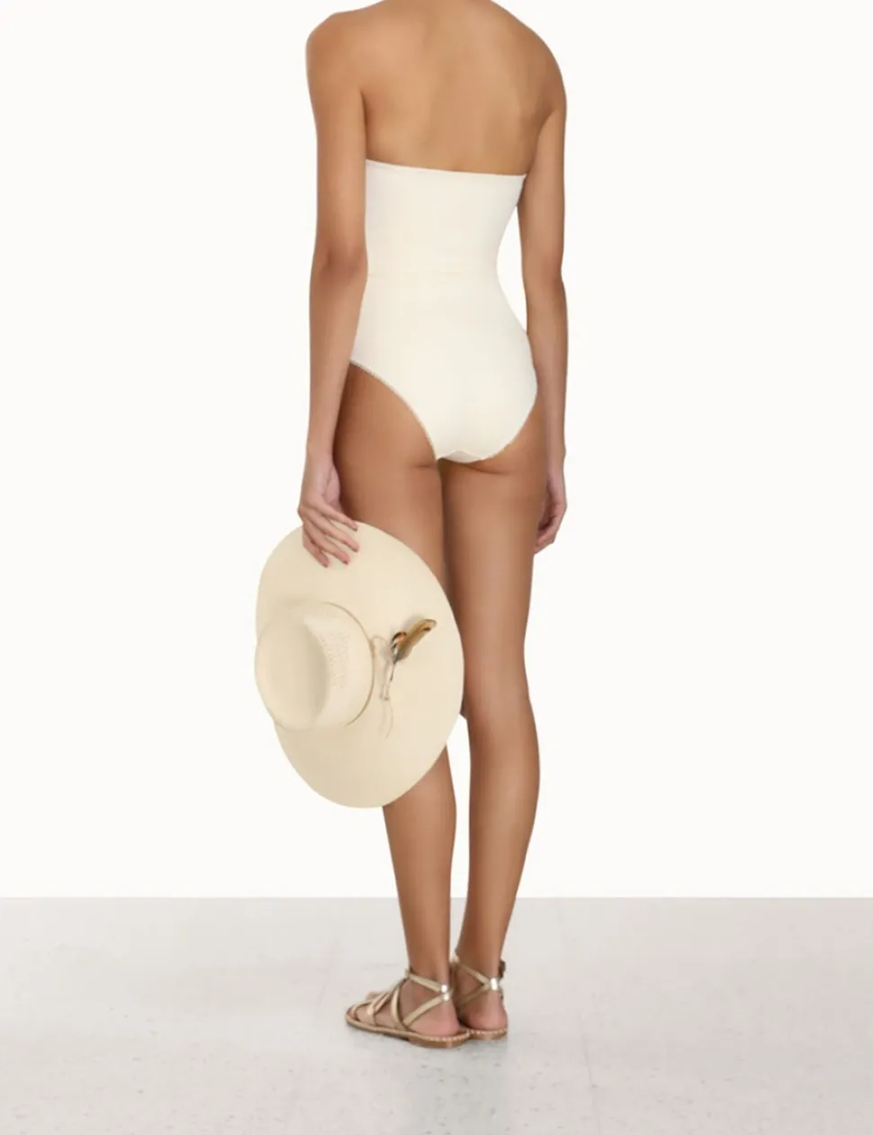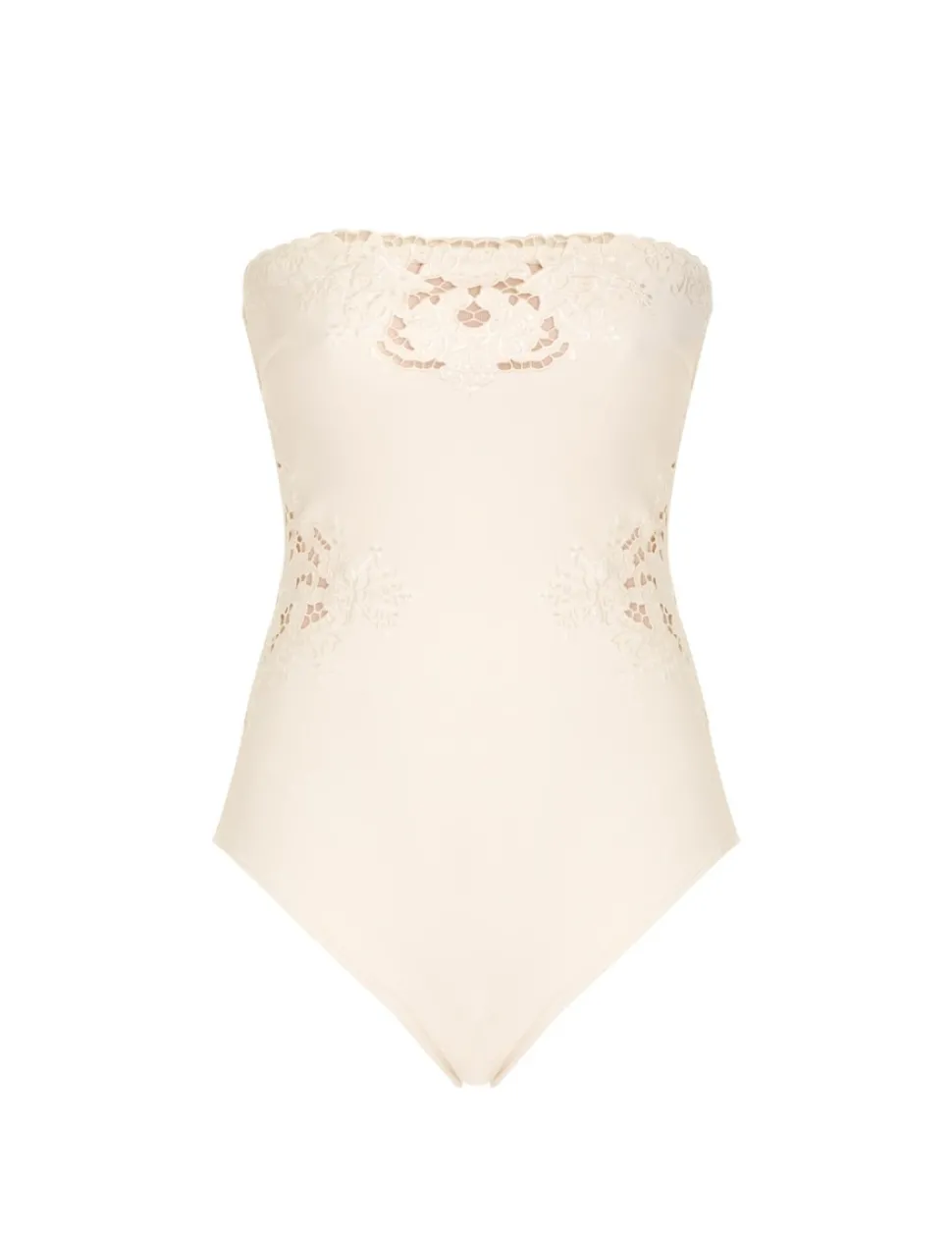 The Halcyon Embroidered 1Pc In Ivory From Our Summer Swim 2023 Collection. An Italian Lycra One Piece Featuring A Bandeau Neckline And Placement Embroidery Throughout.- Italian Lycra One Piece