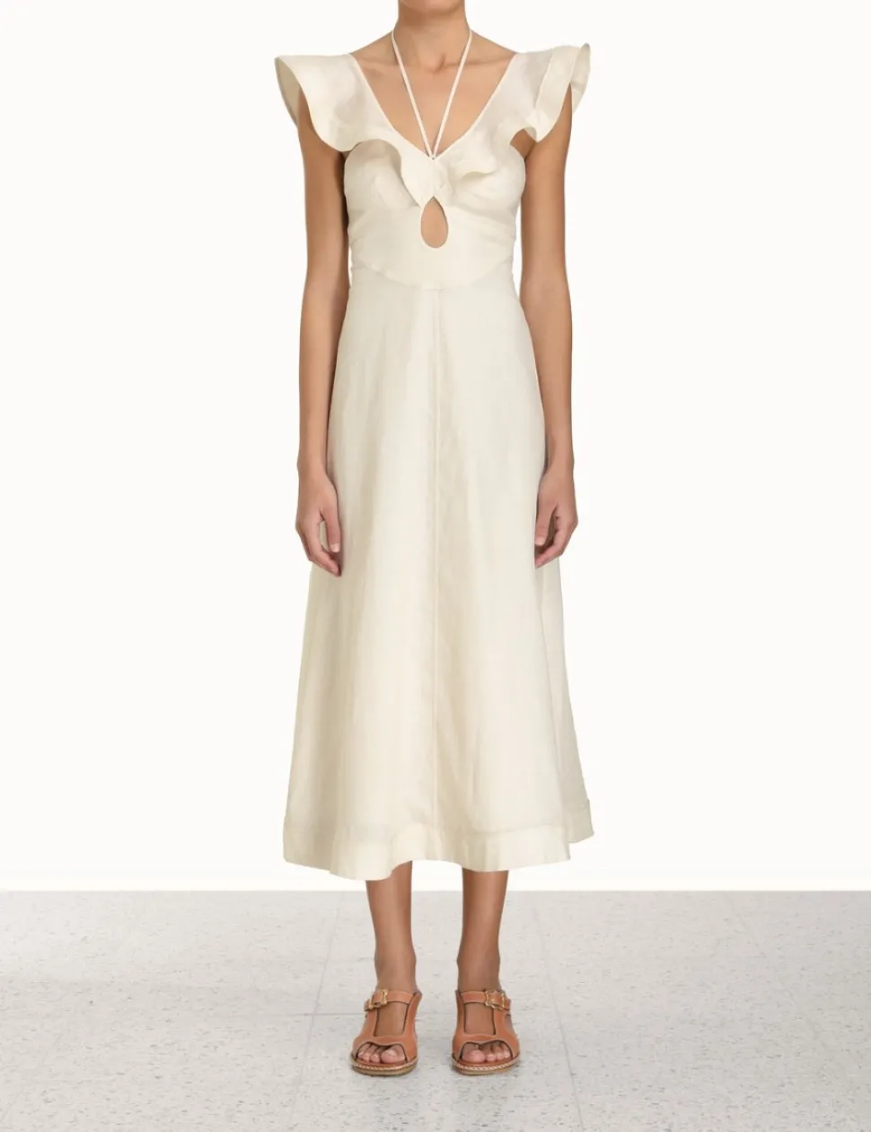 The Halcyon Flutter Midi Dress In Cream From Our Summer Swim 2023 Collection. A Linen Midi Dress Featuring Should Frills, Piping At Hems, And An A-Line Midi Skirt.- Linen Midi Dress