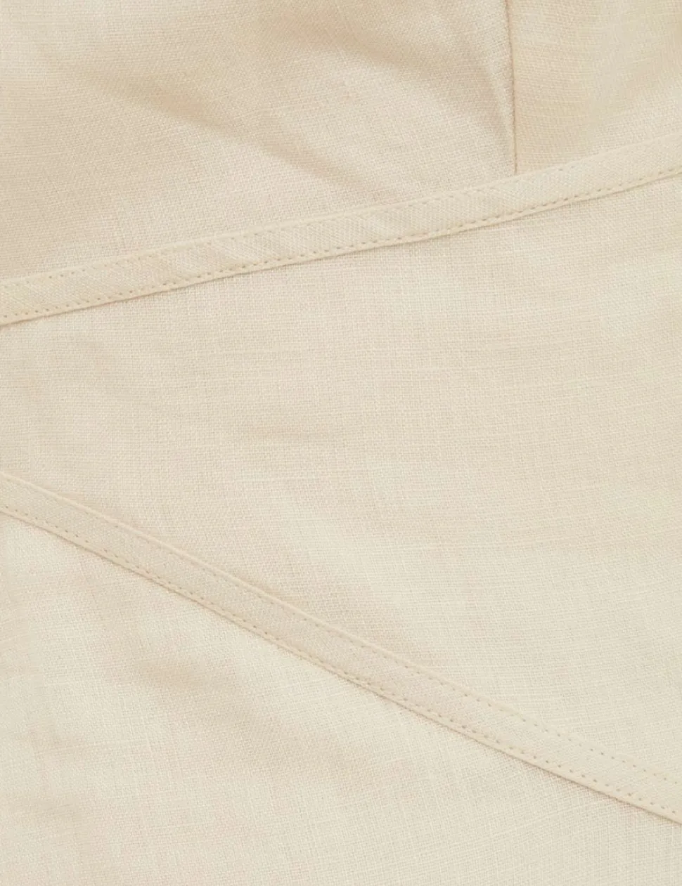 The Halcyon Flutter Midi Dress In Cream From Our Summer Swim 2023 Collection. A Linen Midi Dress Featuring Should Frills, Piping At Hems, And An A-Line Midi Skirt.- Linen Midi Dress