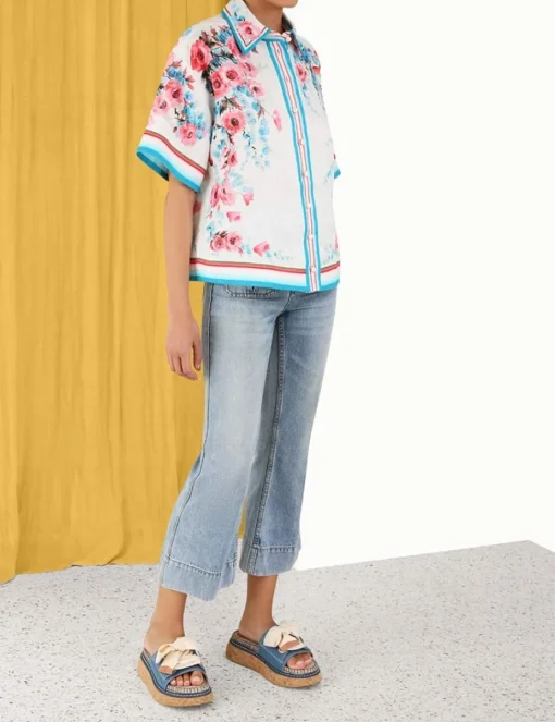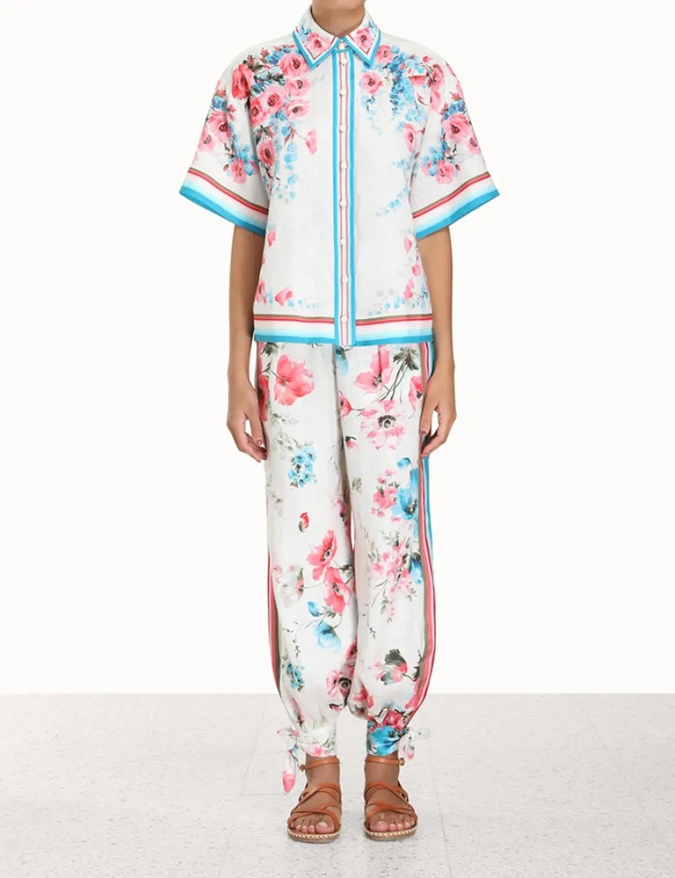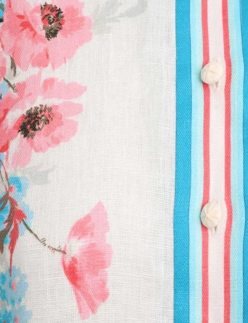 The Halcyon Oversized Shirt In Pink/Blue Floral From Our Summer Swim 2023 Collection. A Linen Shirt Featuring An Oversized Silhouette With Classic Shirt Shaping And A Placement Print Throughout.- Linen Shirt
