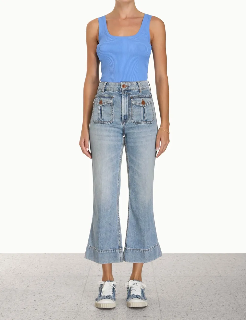 The Halcyon Scoop Neck Tank In Deep Blue From Our Summer Swim 2023 Collection. A Ribbed Knit, Fitted Tank With A Scoop Neckline At The Front And Back.- Fitted, Ribbed Tank