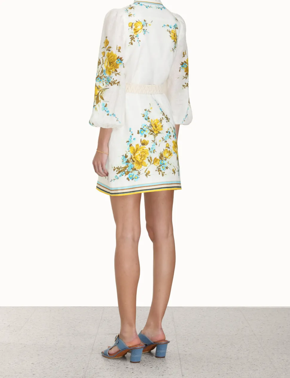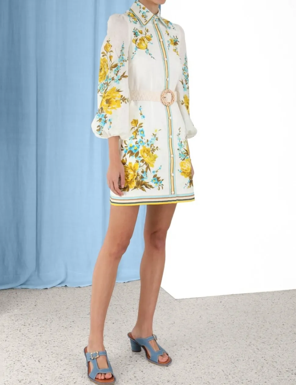 The Halcyon Shirt Dress In Blue/Yellow Floral From Our Summer Swim 2023 Collection. A Linen Mini Dress Featuring Classic Shirt Shaping With Blouson Sleeves And A Placement Print Throughout.- Linen Mini Dress