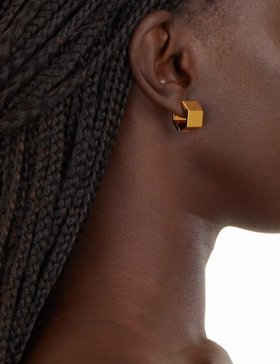 The Hexagon Huggies In Gold From Our Spring 2023 Collection, Wonderland. A Gold Plated Huggie Earring In A Hexagon Shape.- 20K Gold Plated