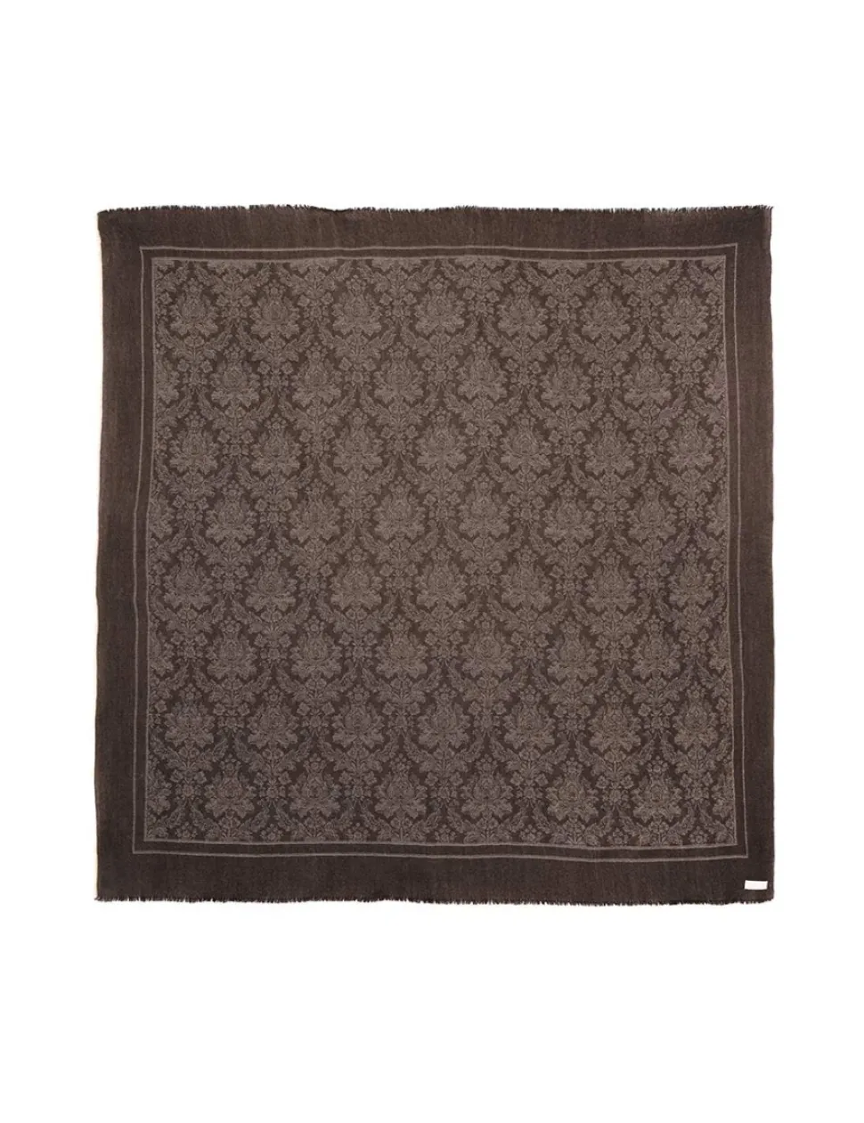 The Jacquard Square Scarf In Black Damask From Our Fall 2023 Collection, Luminosity. A Large Square Scarf Featuring A Jacquard Floral Throughout And Frayed Edges.- Merino Wool