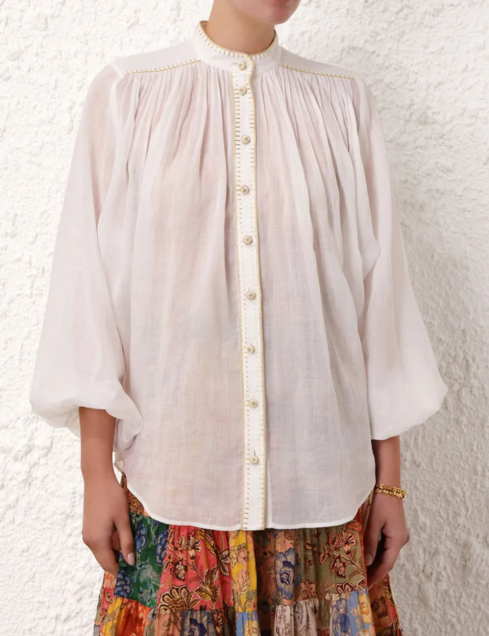 The Junie Billow Blouse In Ivory From Our Resort Swim 2024 Collection. A Long Sleeve Blouse Featuring Buttons Down The Centre Front, Gold Lurex Crochet Edging And Pleats Along The Neckline.- Long Sleeve Ramie Blouse