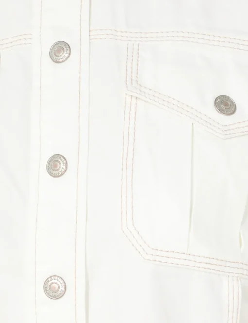 The Junie Denim Utility Shirt In Vintage White From Our Resort Swim 2024 Collection. A Vintage White Denim Shirt In A Utility Style Silhouette.- Short Sleeve Denim Shirt