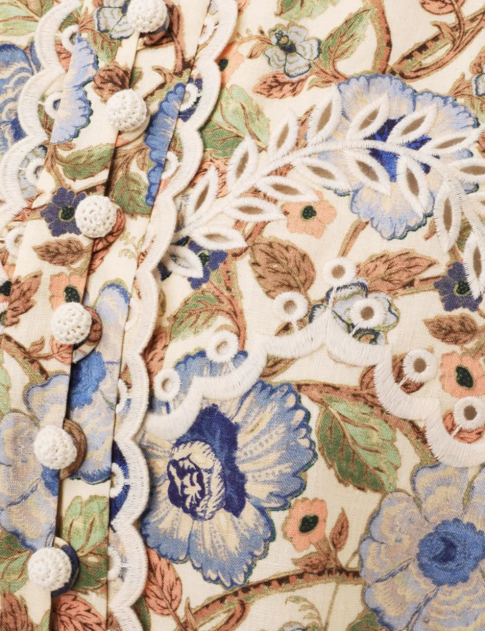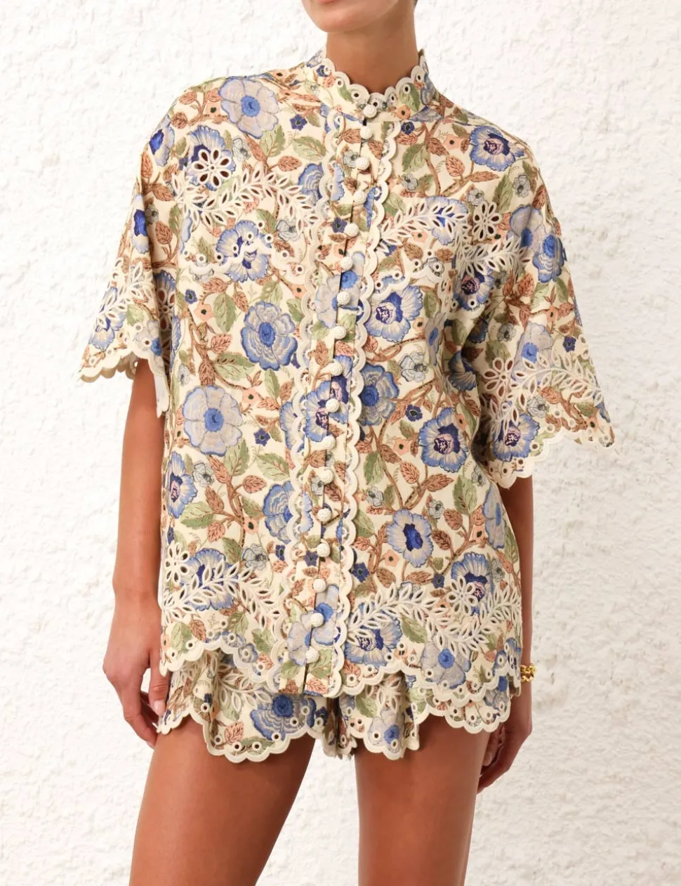 The Junie Embroidered Shirt In Ivory/Blue Floralfrom Our Resort Swim 2024 Collection. A Cotton Short Sleeve Shirt Featuring Placement Embroidery.- Short Sleeve Shirt
