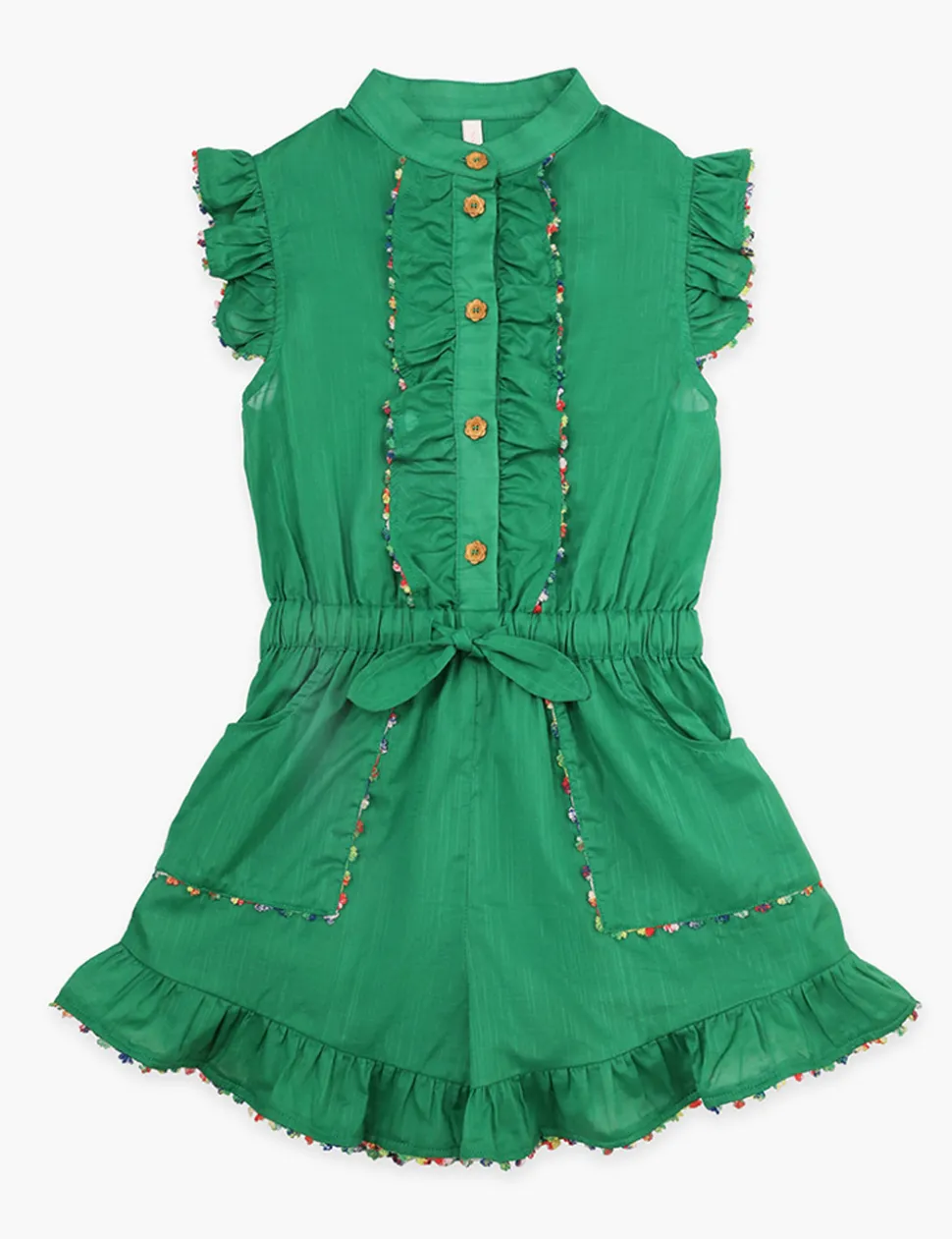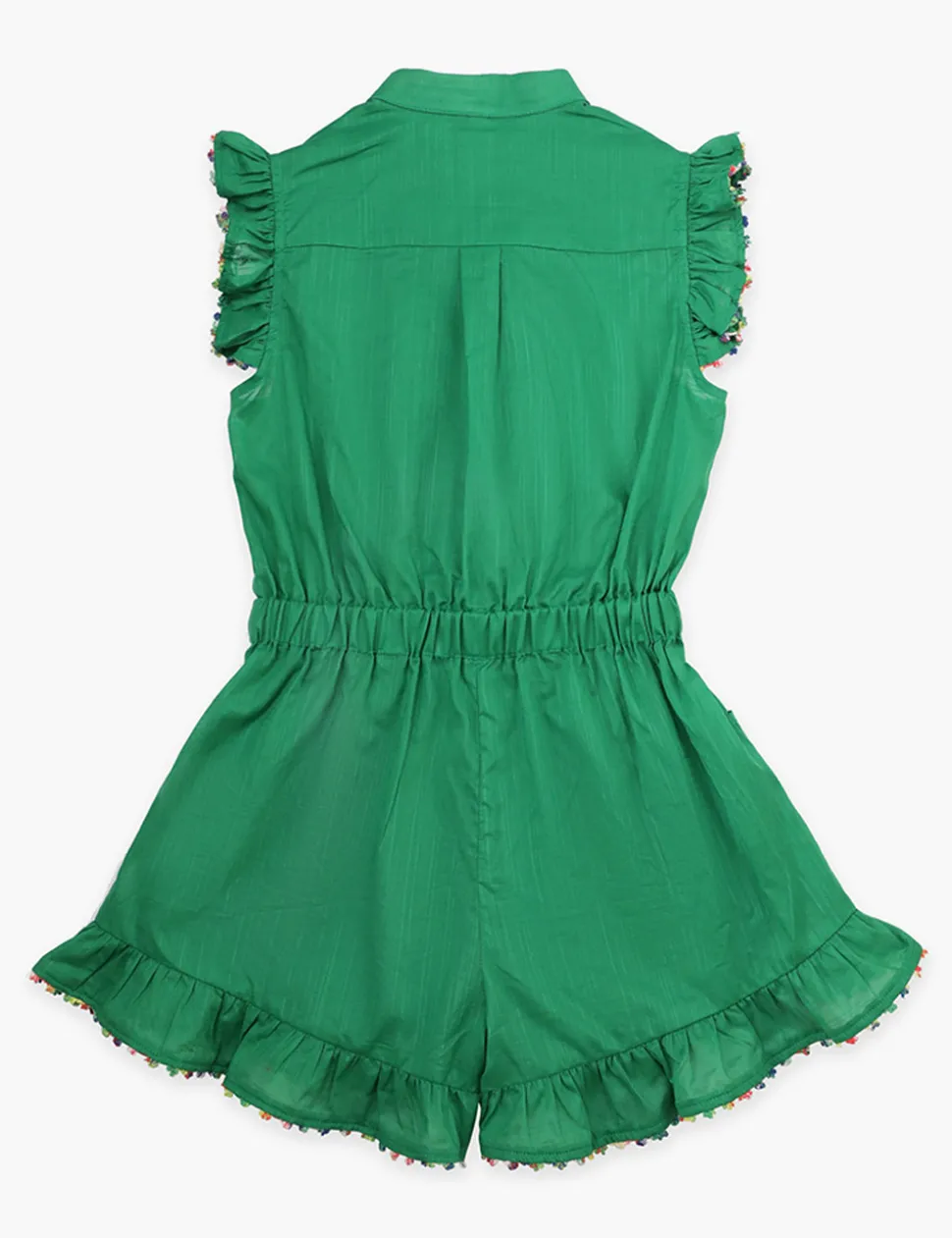 The Junie Frill Playsuit In Green From Our Resort Swim 2024 Collection. A Cotton Playsuit Featuring A Drawstring Waist, Frilled Sleeves And Hems And Scalloped Edging Throughout.- Cotton
