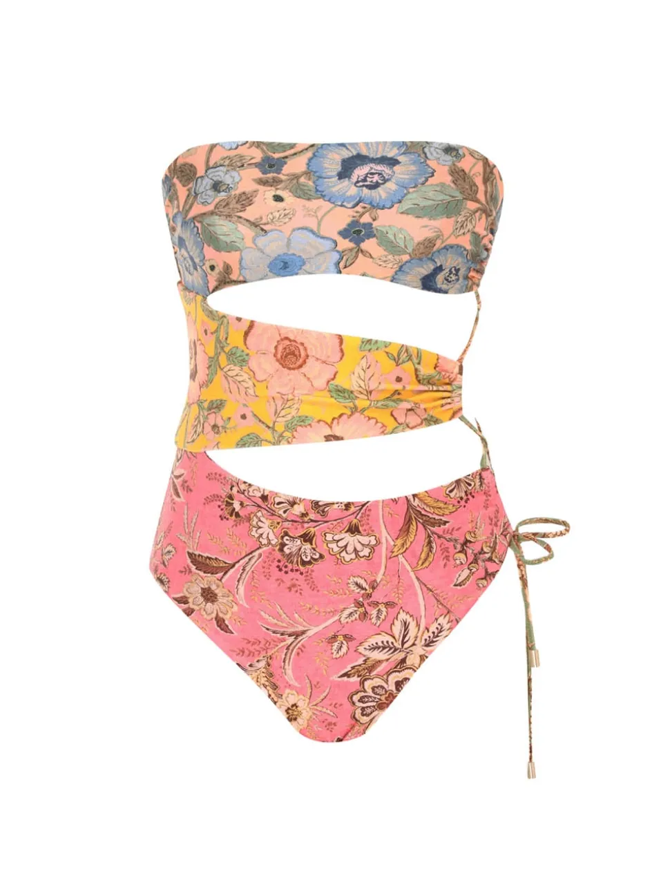 The Junie Lace Up Cutout 1Pc In Spliced From Our Resort Swim 2024 Collection. A Shiny Lycra One Piece Featuring Body Cutouts.- Shiny Lycra One Piece