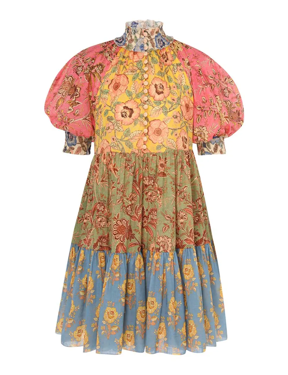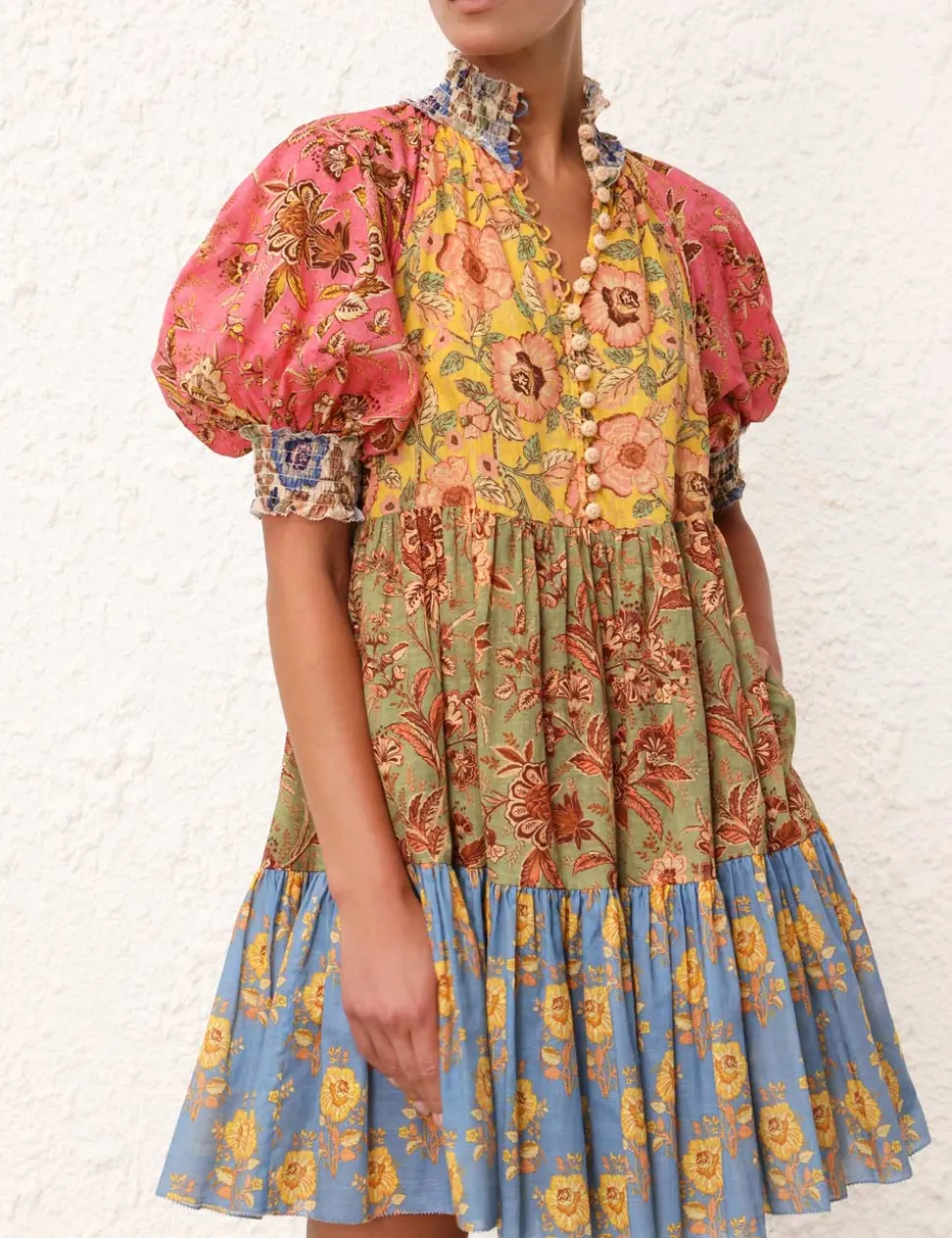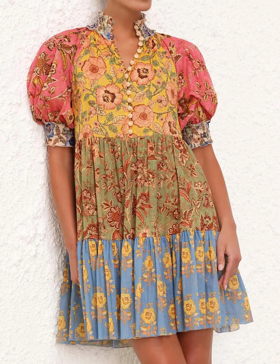 The Junie Lantern Mini Dress In Spliced From Our Resort Swim 2024 Collection. A Cotton Mini Dress In Placement Splice Print Featuring A Picot Trim Edge Throughout And Pockets At The Side Seams.- Cotton Mini Dress