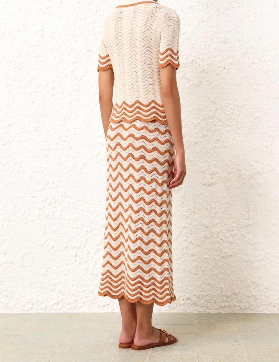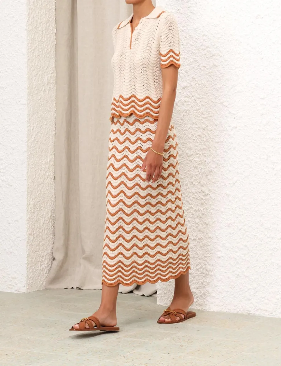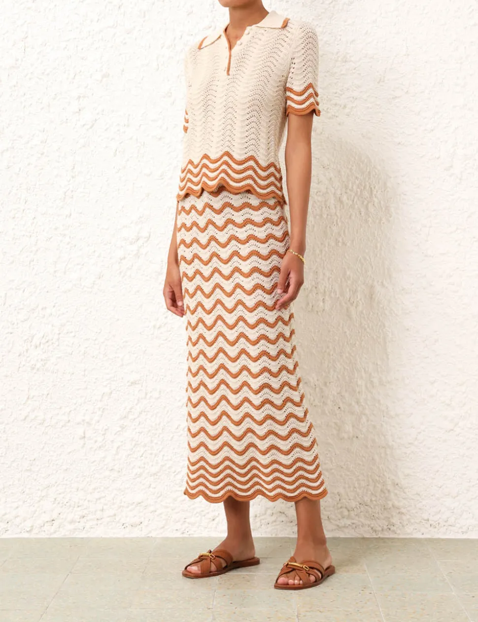 The Junie Textured Knit Polo In Tan/Cream From Our Resort Swim 2024 Collection. A Knitted Polo Featuring Self Yarn Crochet Buttons.- Knit Short Sleeve Polo