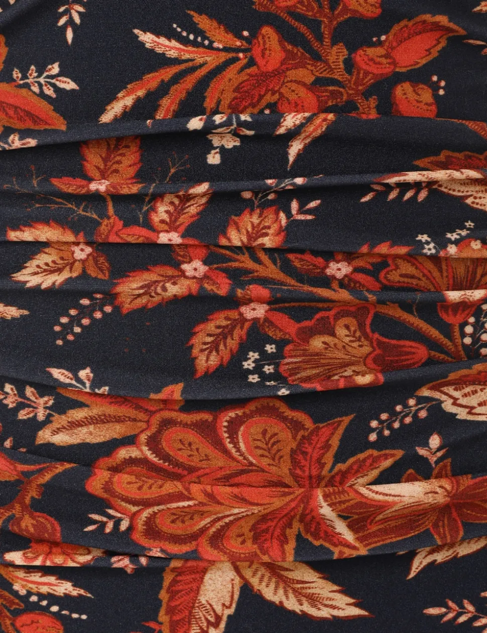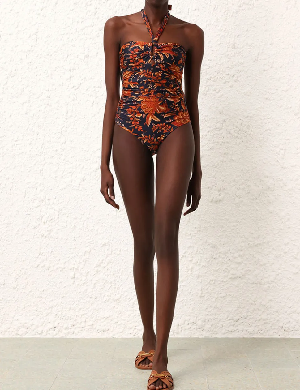 The Junie Wide Link 1Pc In Dark Navy Floral From Our Resort Swim 2024 Collection. A Halter Neck One Piece With Ruched Sides And Wide Link Detail At Centre Bust.- Shiny Italian Lycra