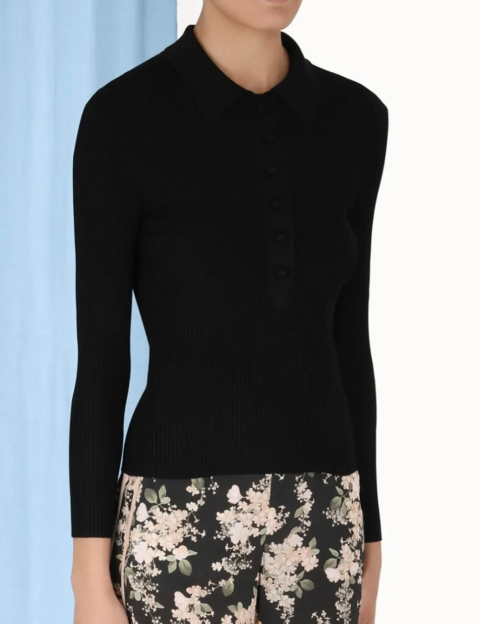 The Knit Polo Top In Black From Our Fall 2023 Collection, Luminosity. A Long Sleeve Knit Polo Featuring A Three Button Closure.- Ribbed Knit Polo Top