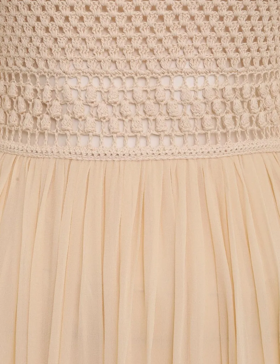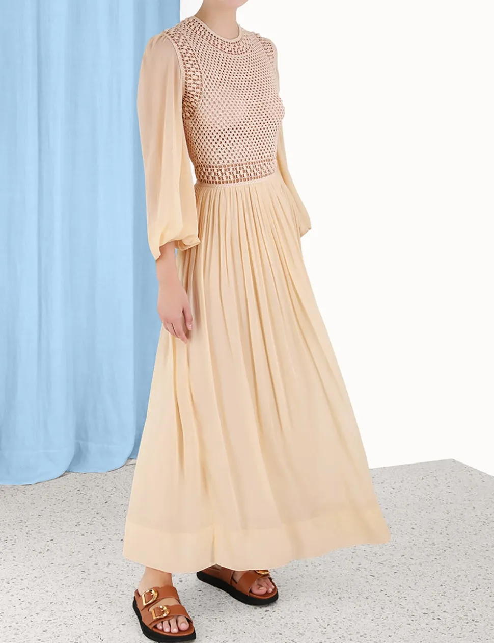 The Luminosity Crochet Bodice Midi In Cream From Our Fall 2023 Collection, Luminosity. A Long Sleeve Midi Dress Featuring A Crochet Bodice And Blouson Sleeves With Elasticated Sleeve Cuffs.- Long Sleeve Midi Dress