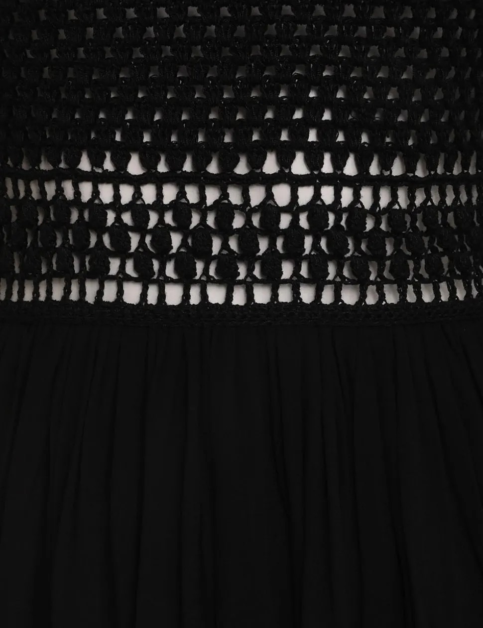 The Luminosity Crochet Bodice Midi In Black From Our Fall 2023 Collection, Luminosity. A Long Sleeve Midi Dress Featuring A Crochet Bodice And Blouson Sleeves With Elasticated Sleeve Cuffs.- Long Sleeve Midi Dress