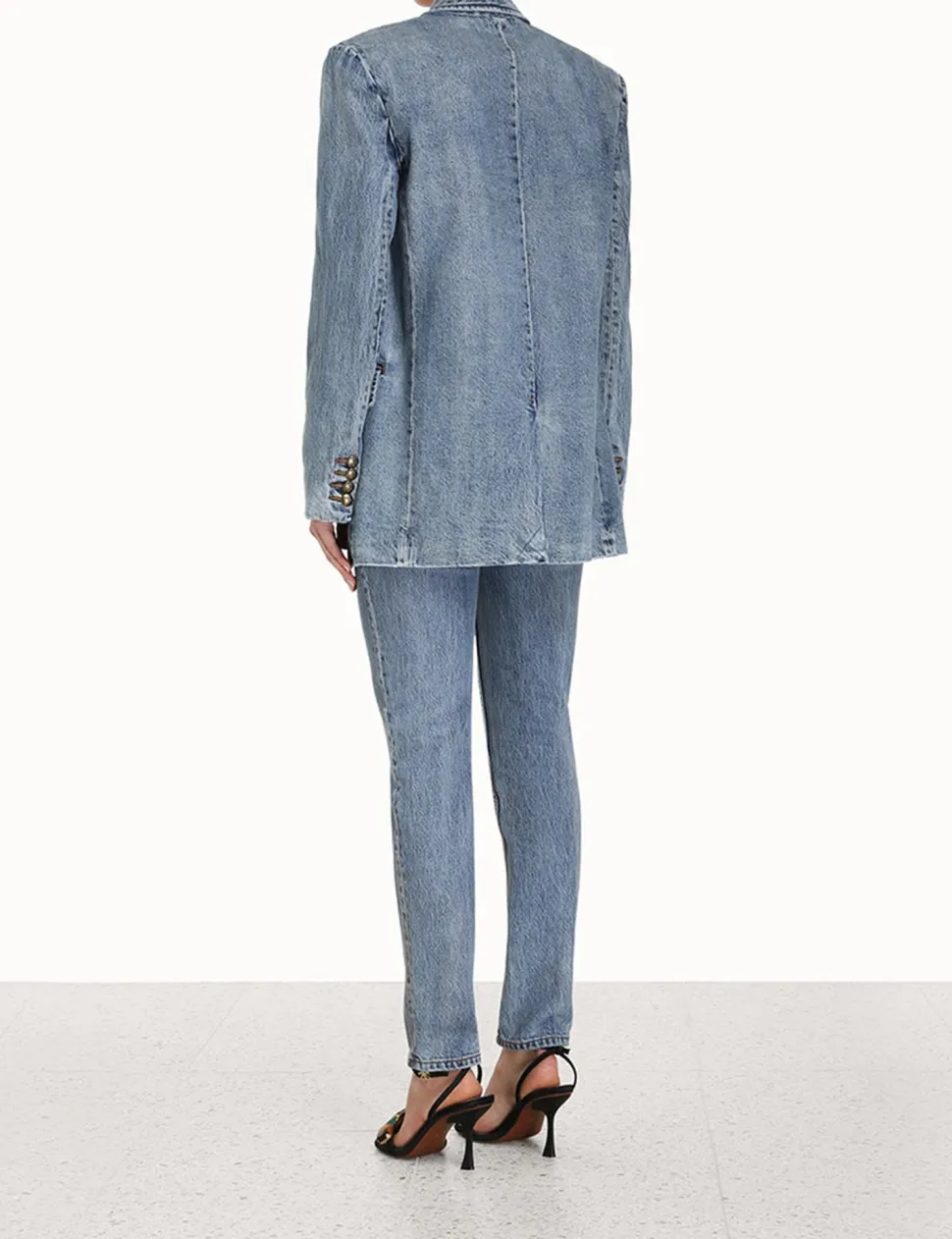 The Luminosity Denim Blazer In Briny Blue From Our Fall 2023 Collection, Luminosity. An Oversized Denim Blazer Featuring Custom Printed Metal Buttons And A Double Breasted Closure.- Rigid Denim