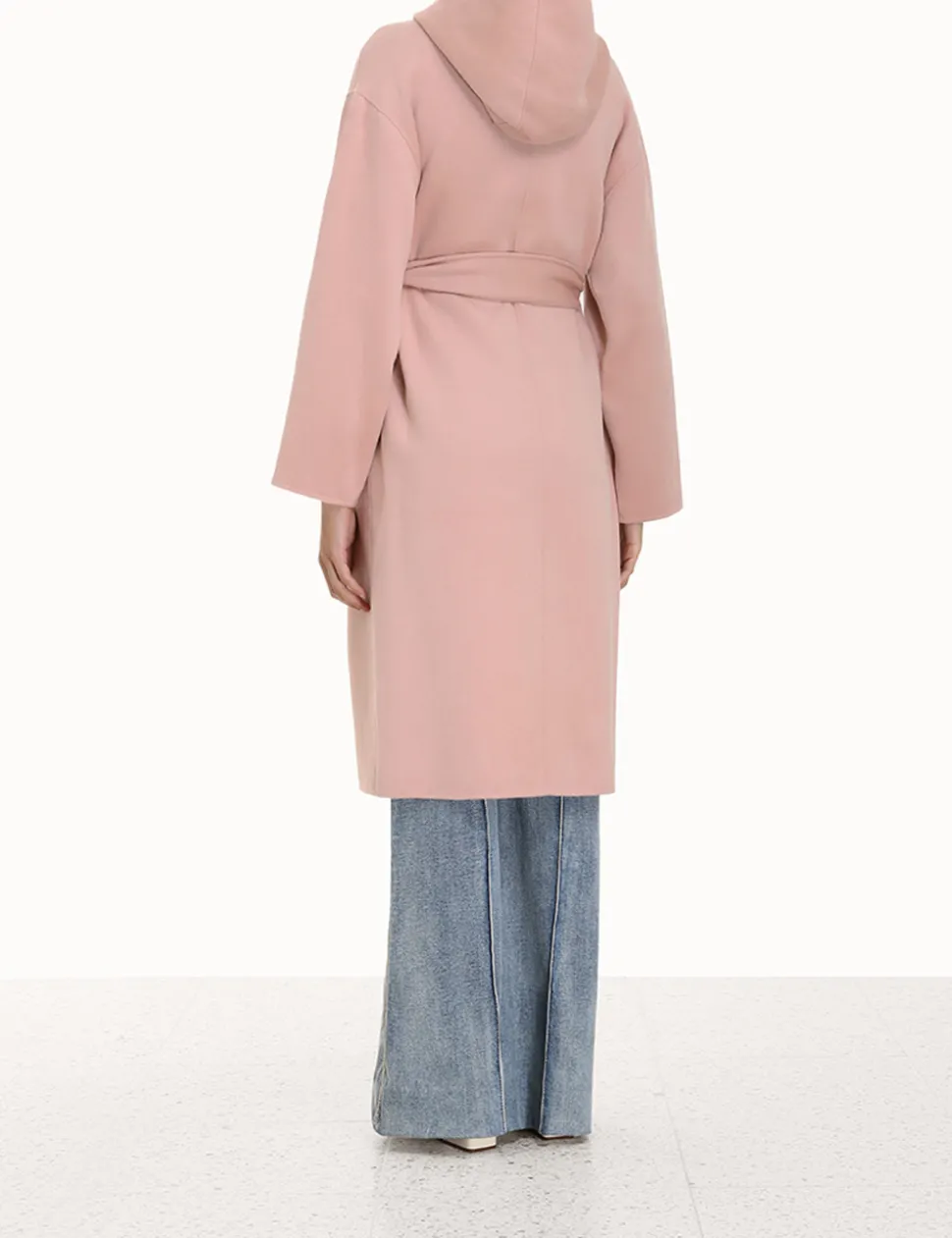The Luminosity Felted Hooded Coat In Dusty Pink From Our Fall 2023 Collection, Luminosity. A Wrap Style Wool Coat Featuring A Hood And In Seam Pockets.- Wool Coat