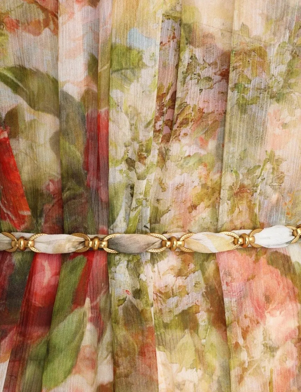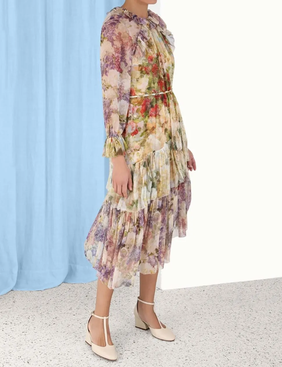 The Luminosity Frill Midi Dress In Multi Spliced Floral From Our Fall 2023 Collection, Luminosity. A Silk Georgette Midi Dress Featuring Frills Throughout, Picot Edge Trims, And Raglan Sleeves With Elasticated Cuffs.- Silk Georgette Midi Dress