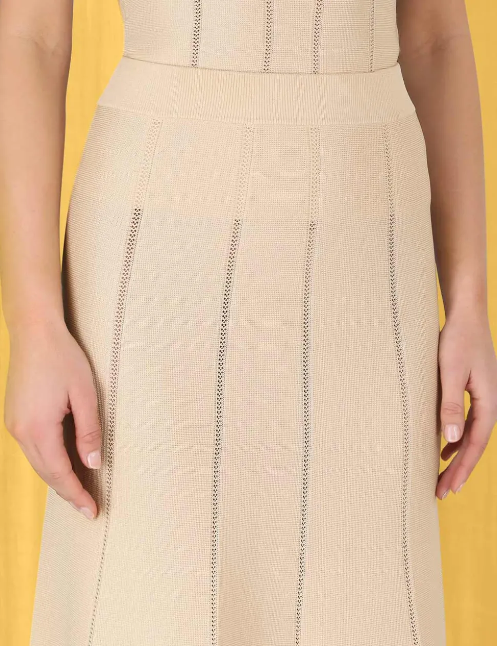 The Luminosity Knit Panelled Skirt In Cream From Our Fall 2023 Collection, Luminosity. A Knitted Skirt Featuring An Elastic Waist And A Pointelle Stitch Detail Throughout.- Knitted Mini Dress