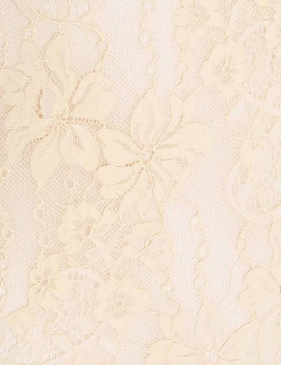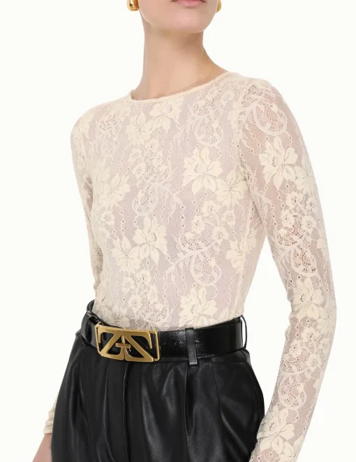 The Luminosity Lace Bodysuit In Parchment From Our Fall 2023 Collection, Luminosity. A Lace Bodysuit Featuring A Crew Neck And Long Sleeves.- Stretch Lace