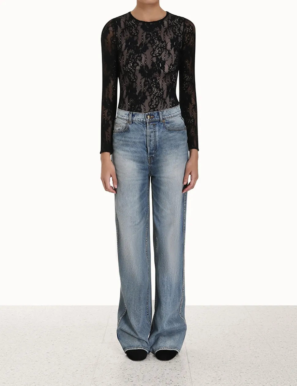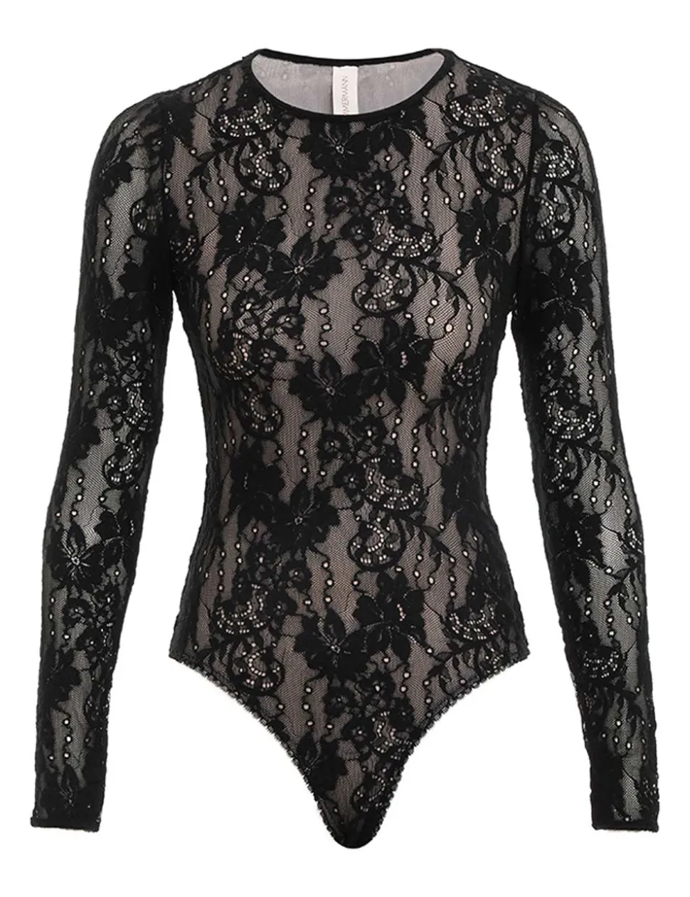The Luminosity Lace Bodysuit In Black From Our Fall 2023 Collection, Luminosity. A Lace Bodysuit Featuring A Crew Neck And Long Sleeves.- Stretch Lace