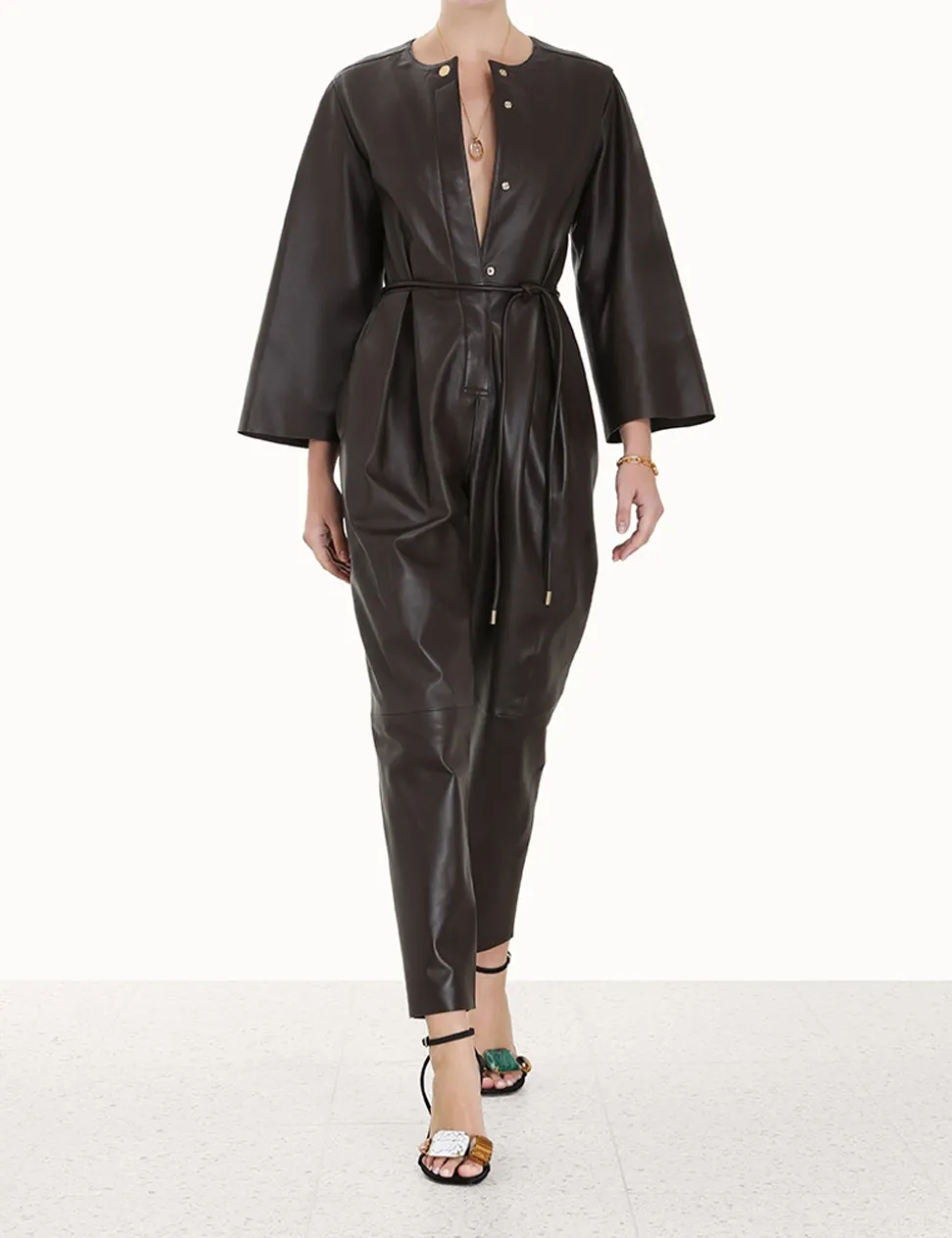 The Luminosity Leather Jumpsuit In Espresso From Our Fall 2023 Collection, Luminosity. A Leather Long Sleeve Jumpsuit Featuring A Crew Neck And Straight Legs, Finished With A Self Tie Waist.- Leather Jumpsuit