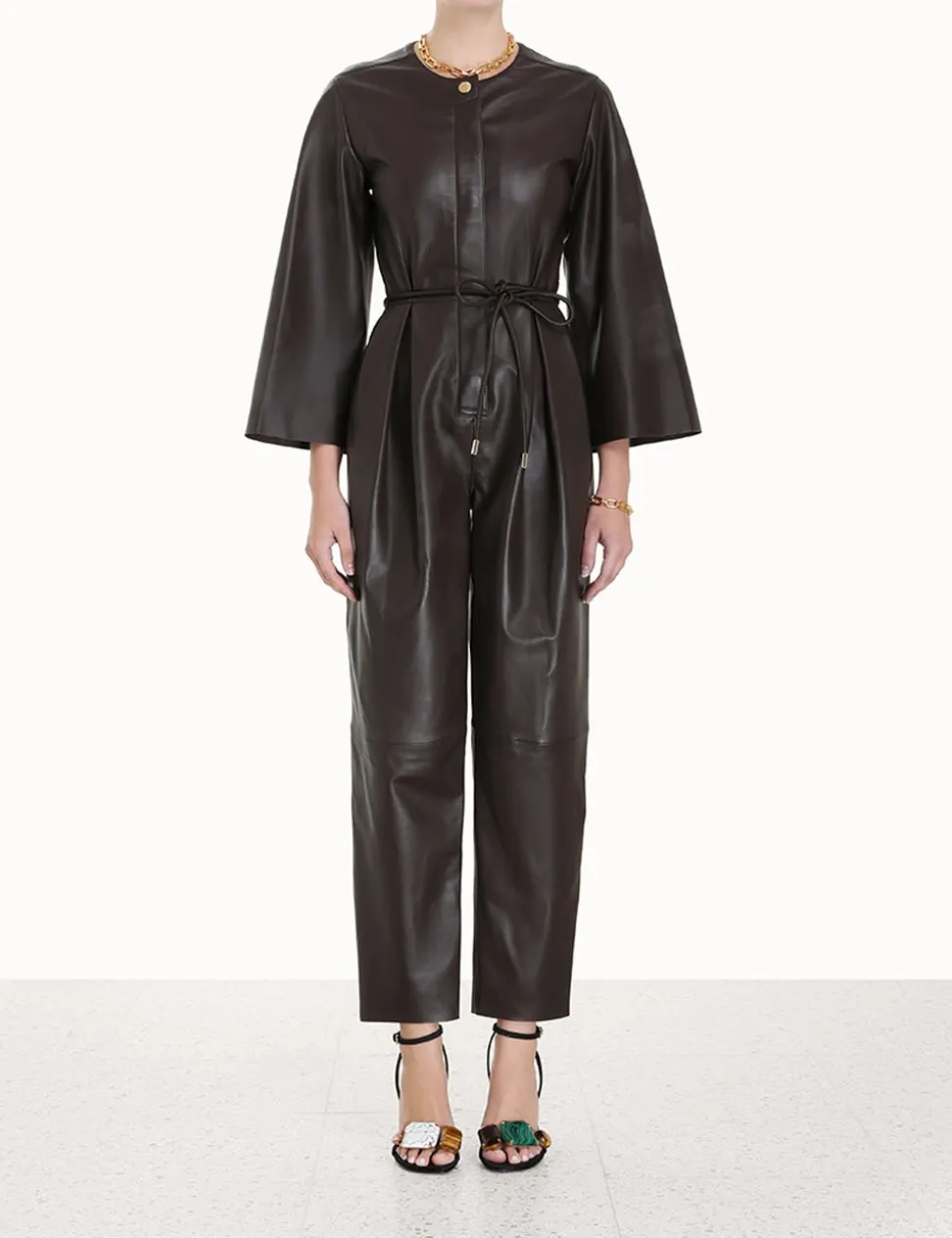 The Luminosity Leather Jumpsuit In Espresso From Our Fall 2023 Collection, Luminosity. A Leather Long Sleeve Jumpsuit Featuring A Crew Neck And Straight Legs, Finished With A Self Tie Waist.- Leather Jumpsuit
