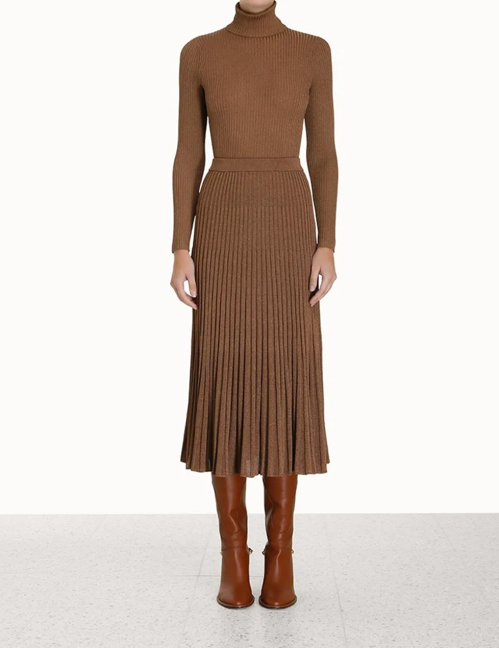 The Luminosity Lurex Rayon Top In Tan From Our Fall 2023 Collection, Luminosity. A Slim Fit Top Featuring A High Turtle Neck And A Lurex Finish.- Long Sleeve Top