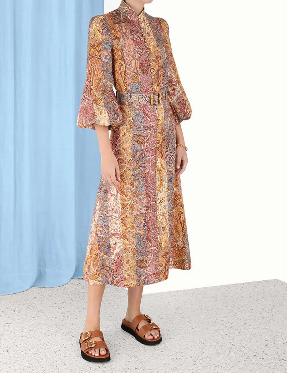 The Luminosity Paisley Blouse In Multi Paisley Stripe From Our Fall 2023 Collection, Luminosity. A Ramie Long Sleeve Blouse Featuring Self Piped Edges And Rouleau Loops And Buttons Along The Centre Front.- Ramie Long Sleeve Printed Blouse