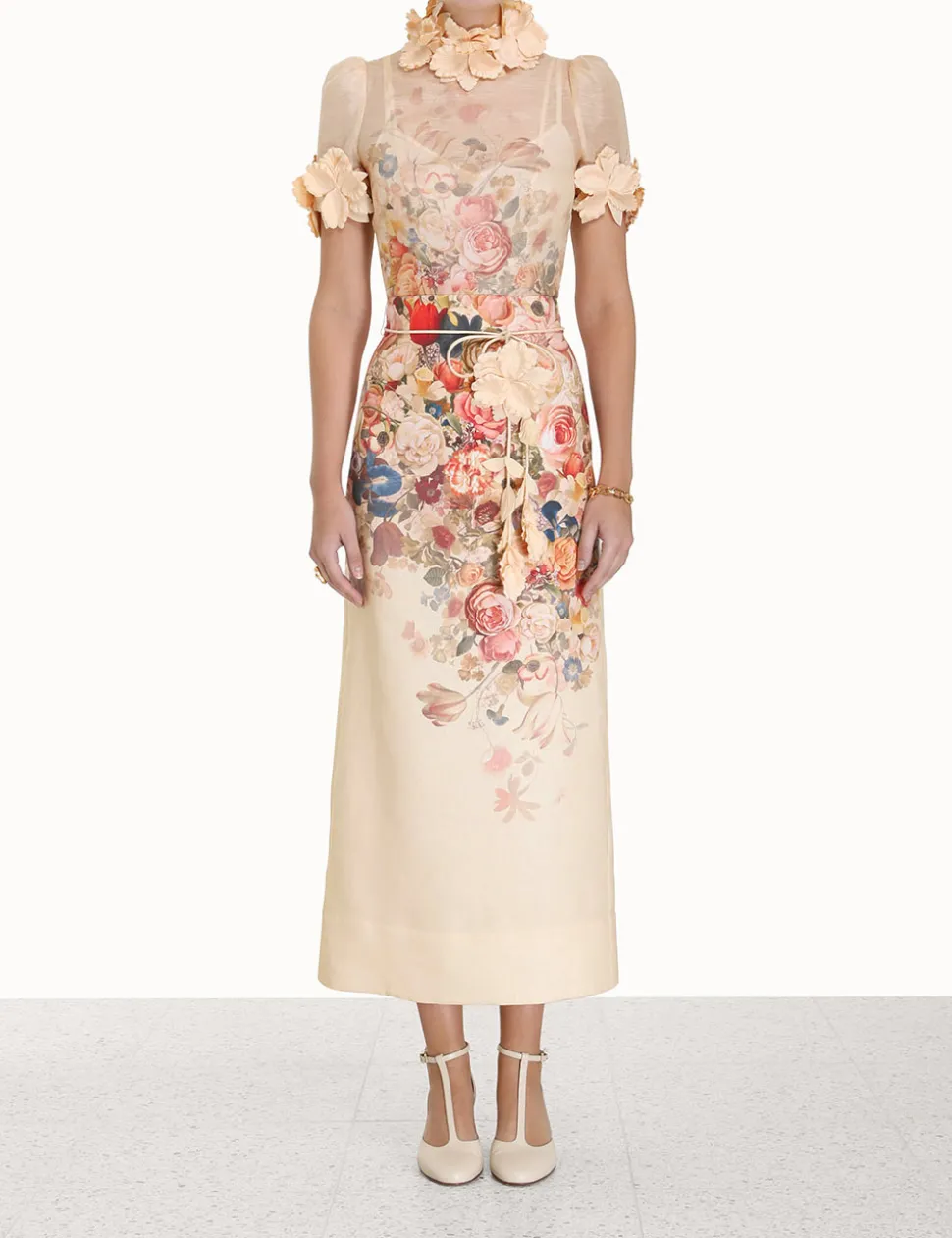 The Luminosity Pencil Skirt In Morisot Cream Print From Our Fall 2023 Collection, Luminosity. A Linen Midi Skirt Featuring A Removable Floral Belt.- Linen Midi Skirt