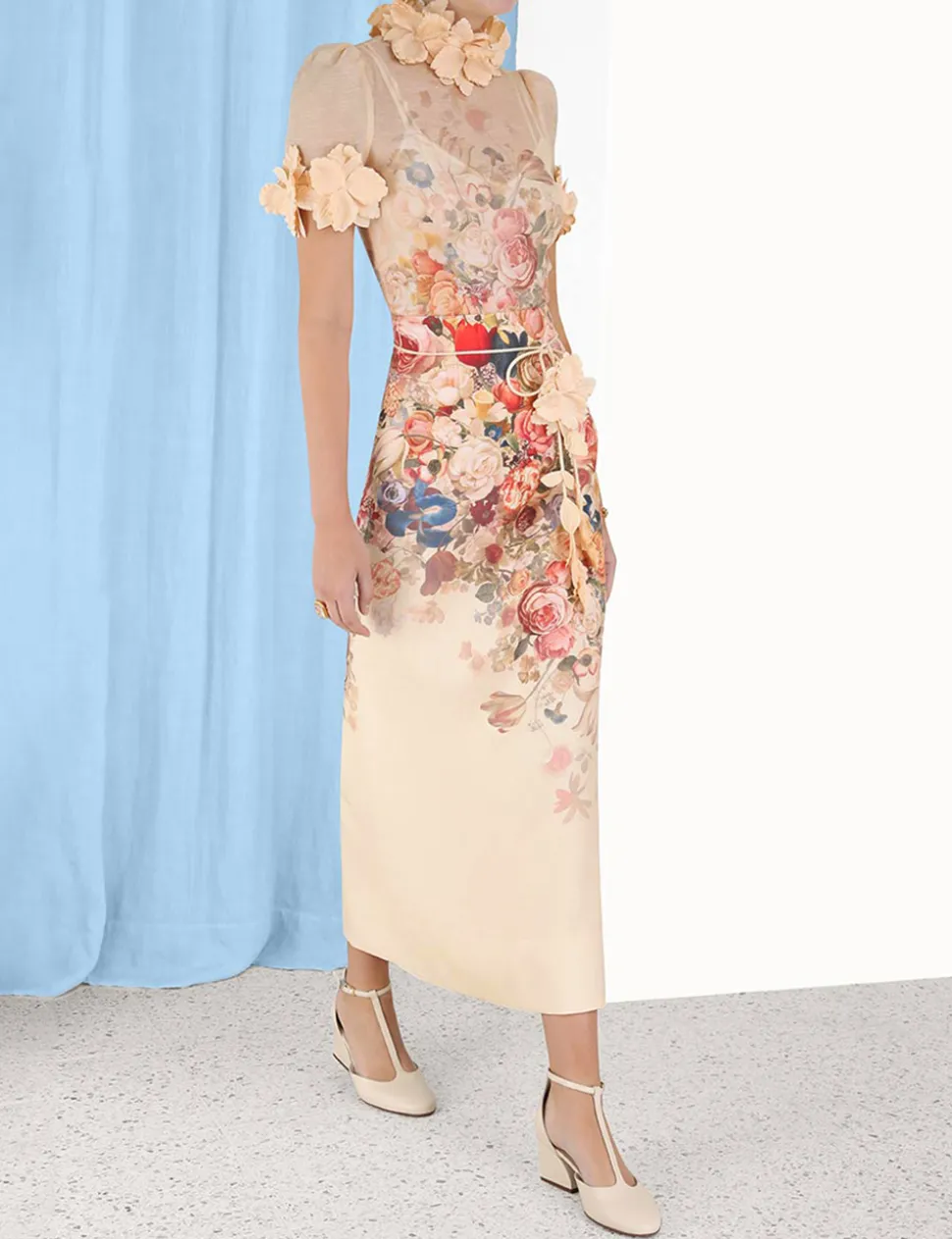 The Luminosity Pencil Skirt In Morisot Cream Print From Our Fall 2023 Collection, Luminosity. A Linen Midi Skirt Featuring A Removable Floral Belt.- Linen Midi Skirt