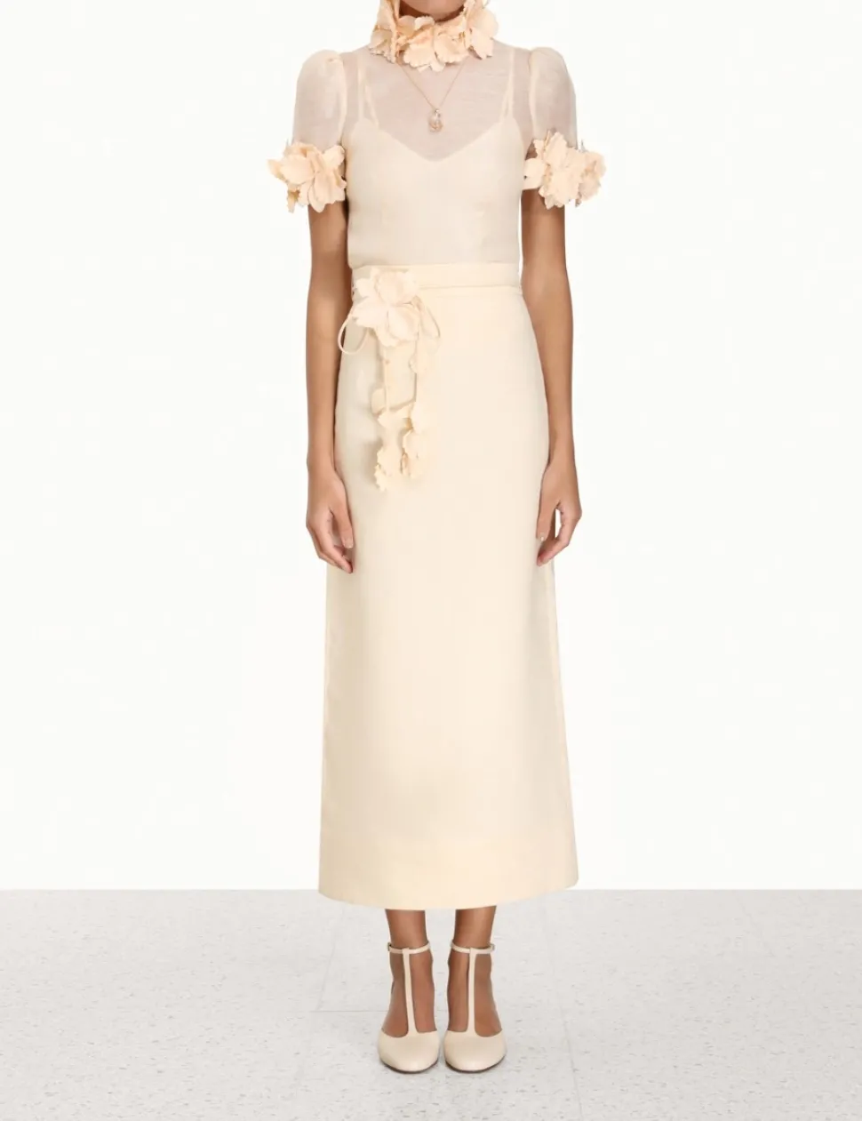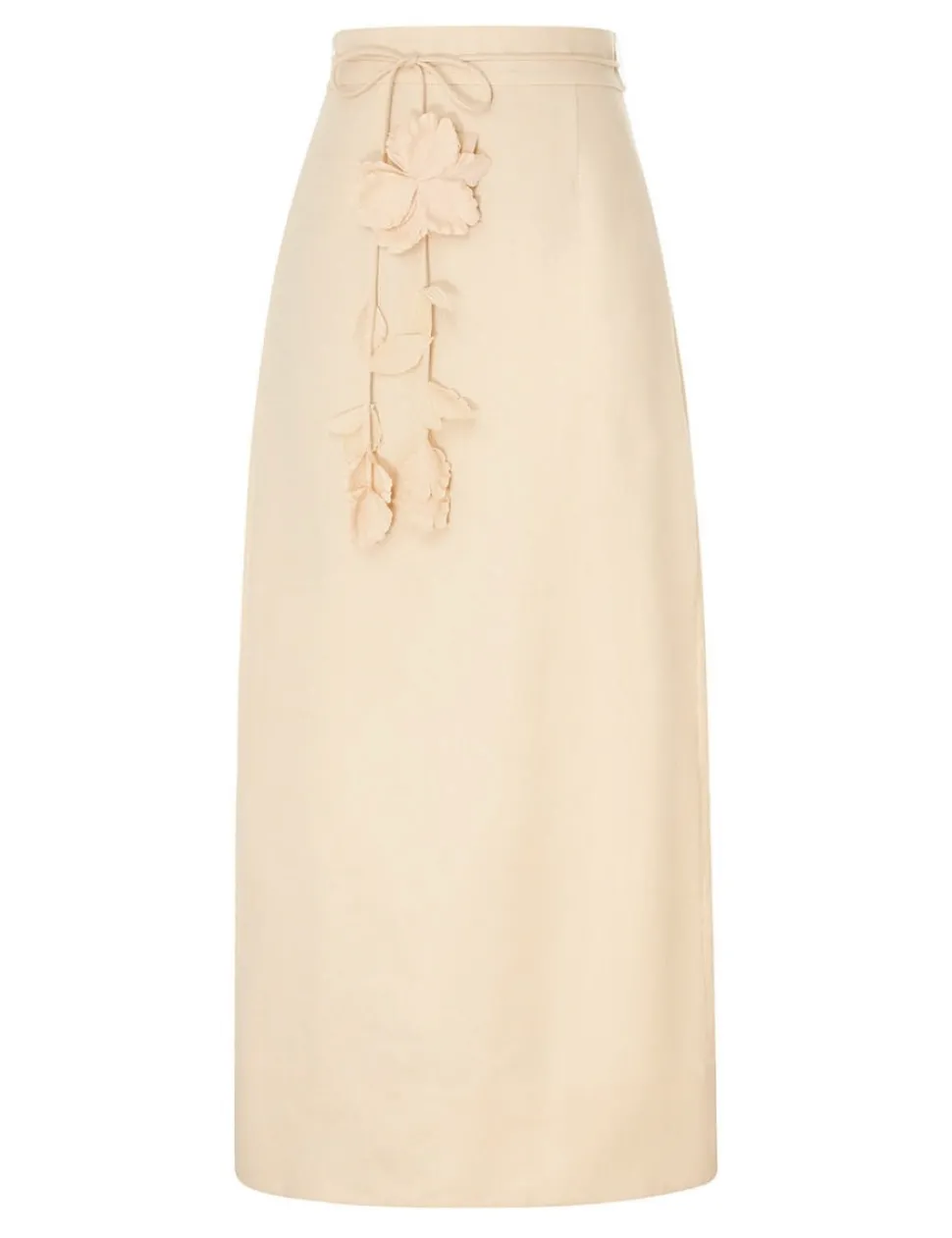 The Luminosity Pencil Skirt In Cream From Our Fall 2023 Collection, Luminosity. A Linen Midi Skirt Featuring A Removable Floral Belt.- Linen Midi Skirt