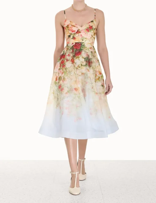 The Luminosity Picnic Dress In Rosy Garden Print From Our Fall 2023 Collection, Luminosity. A Silk Linen Midi Dress Featuring A Fitted Bustier, Shirred Back Bust And Adjustable Shoulder Straps.- Linen