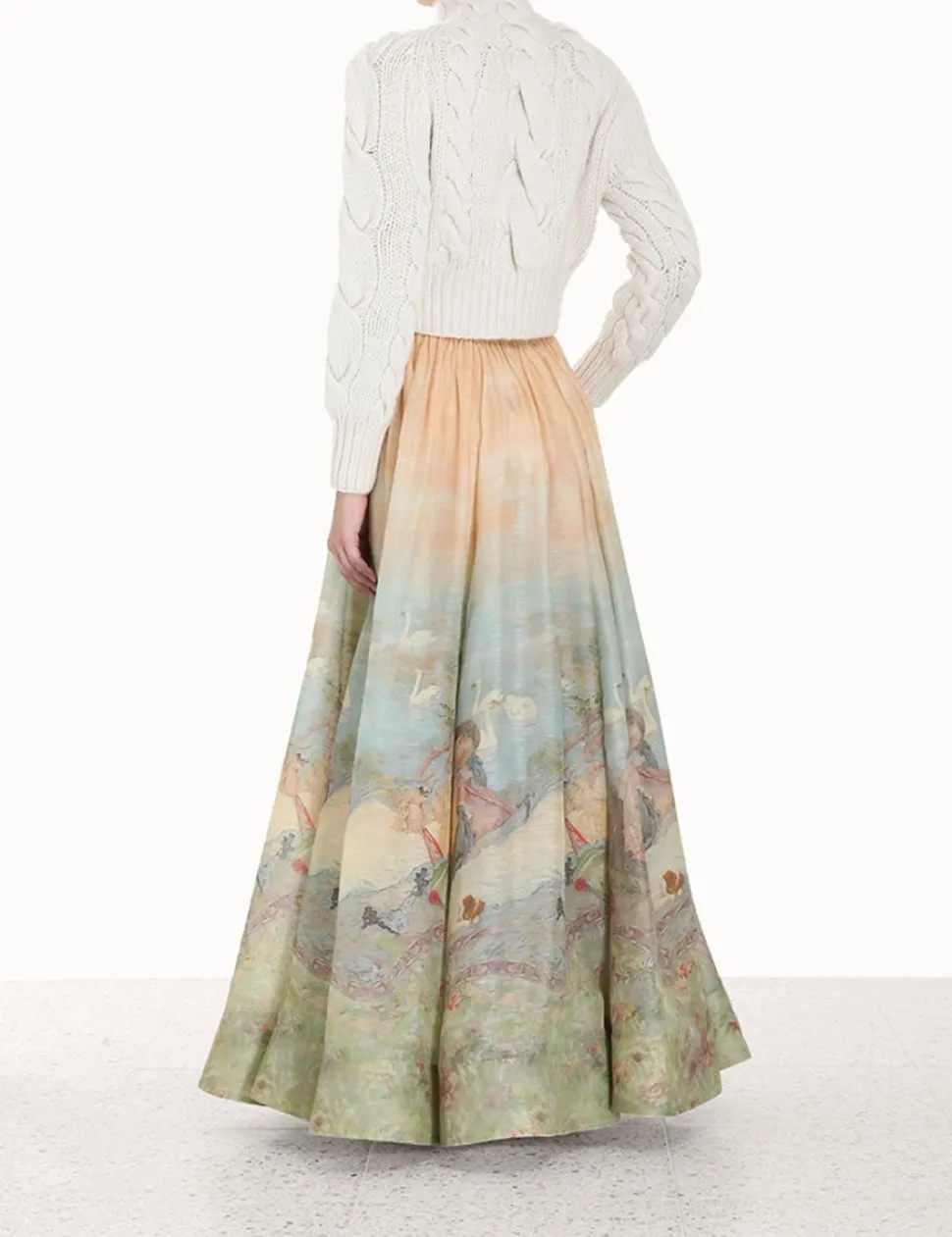 The Luminosity Ruched Maxi Skirt In Endormies Print From Our Fall 2023 Collection, Luminosity. A Silk Linen Maxi Skirt Featuring A Pleated Detail Along The Waistband And Side Seam Pockets.- Silk Linen Skirt