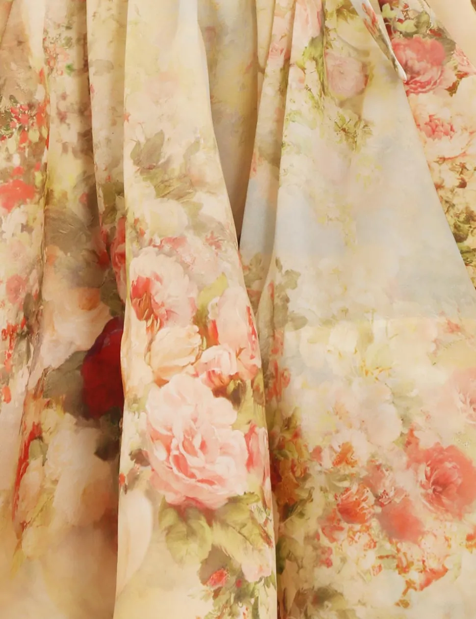 The Luminosity Ruched Mini Dress In Rosy Garden Floral From Our Fall 2023 Collection, Luminosity. A Silk Mini Dress Featuring A Statement Brooch And Bias Cut Bodice, Finished With A Full Mini Skirt.- Silk Mini Dress
