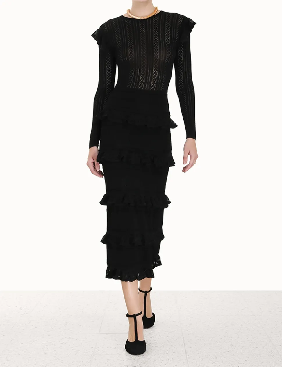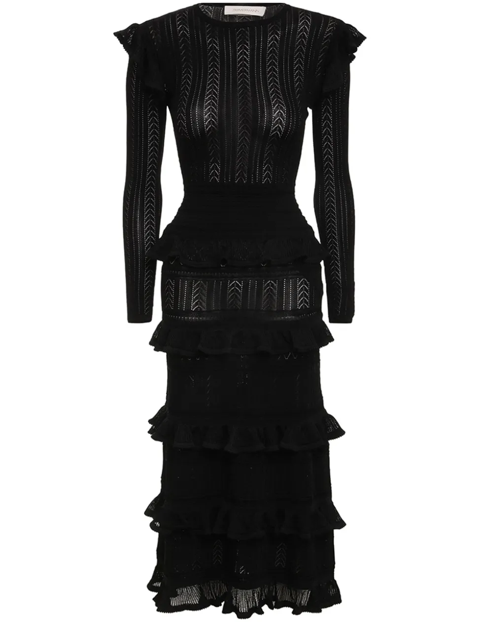 The Luminosity Ruffle Dress In Black From Our Fall 2023 Collection, Luminosity. A Knitted Midi Dress Featuring Ruffled Details Throughout.- Textured Knit