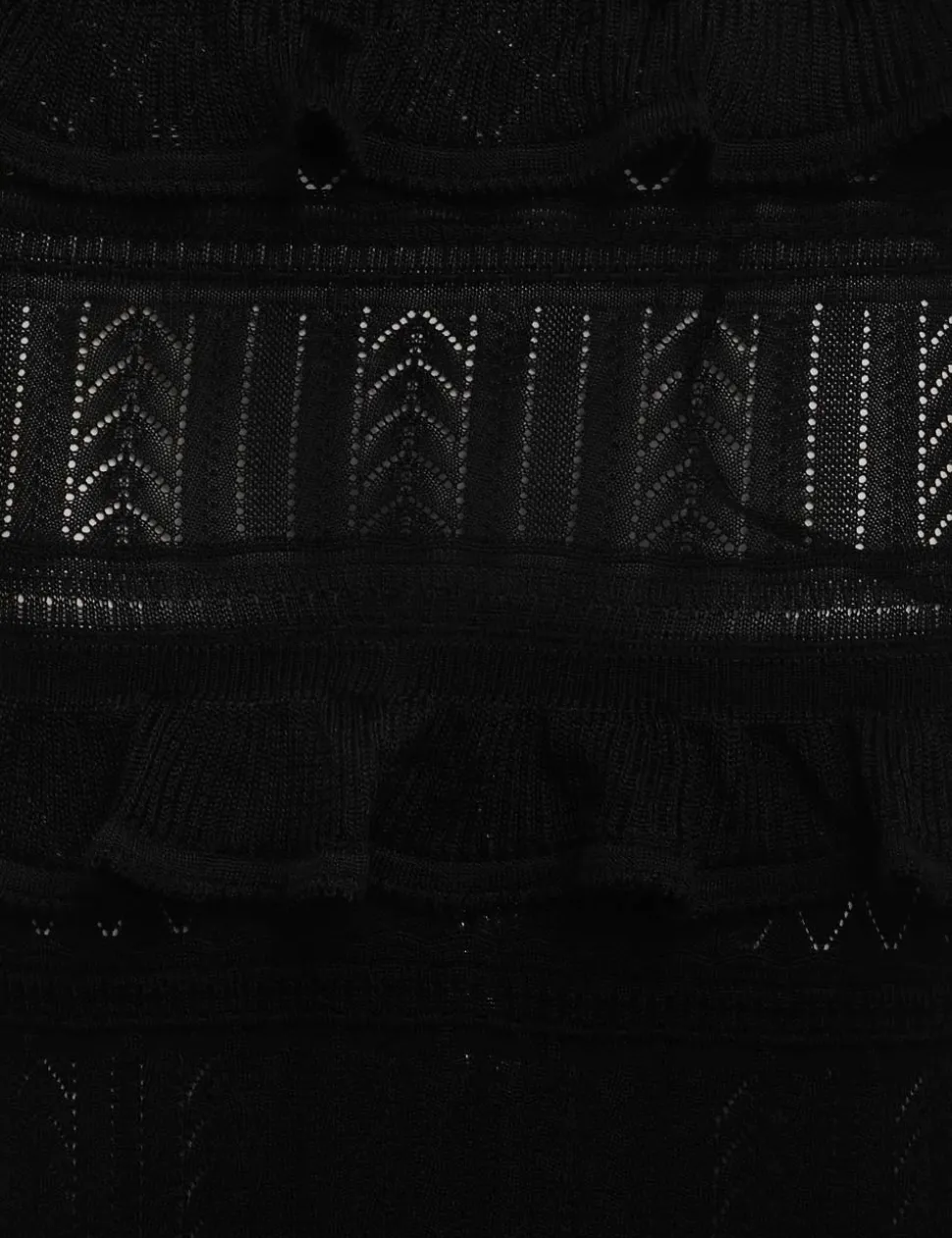 The Luminosity Ruffle Dress In Black From Our Fall 2023 Collection, Luminosity. A Knitted Midi Dress Featuring Ruffled Details Throughout.- Textured Knit