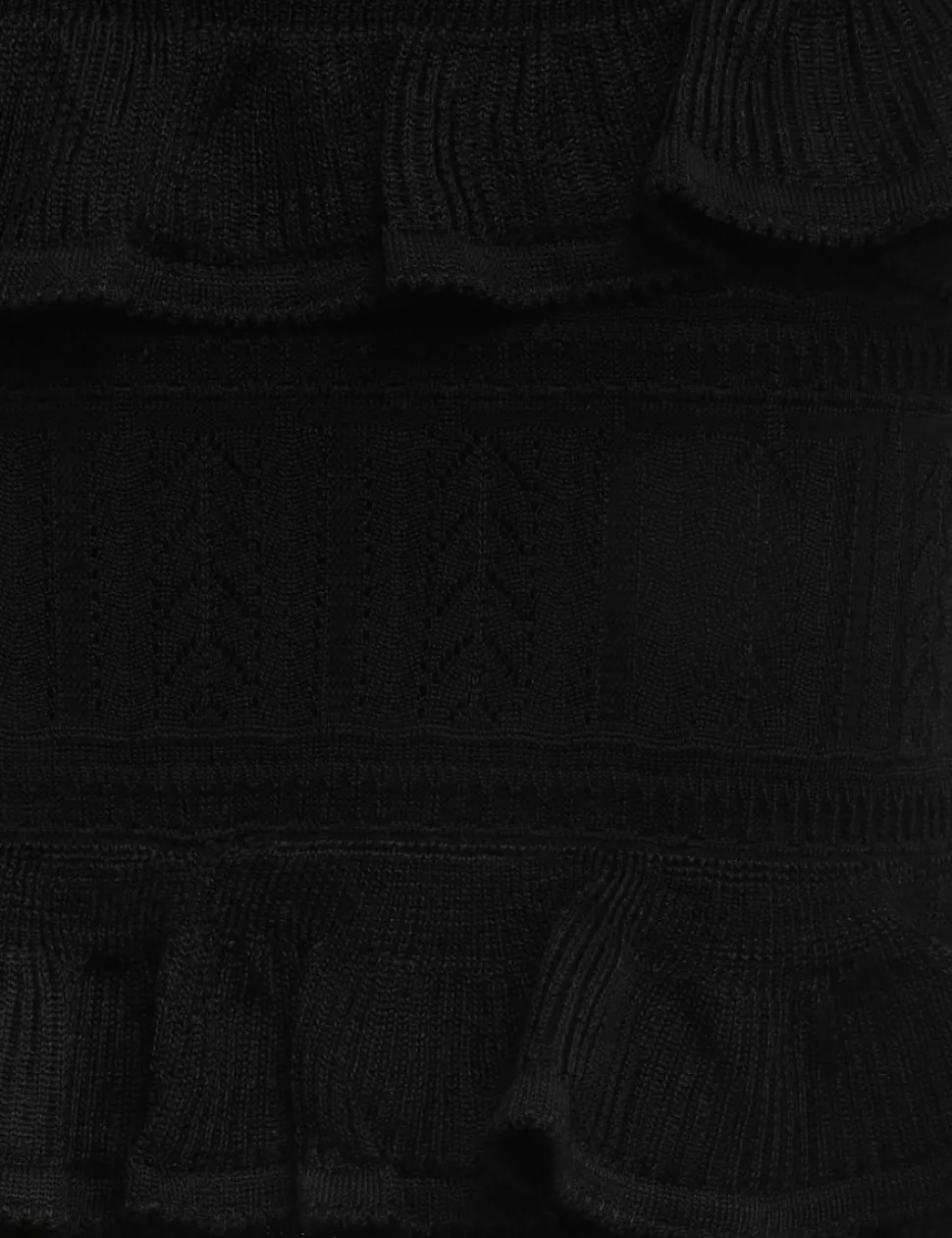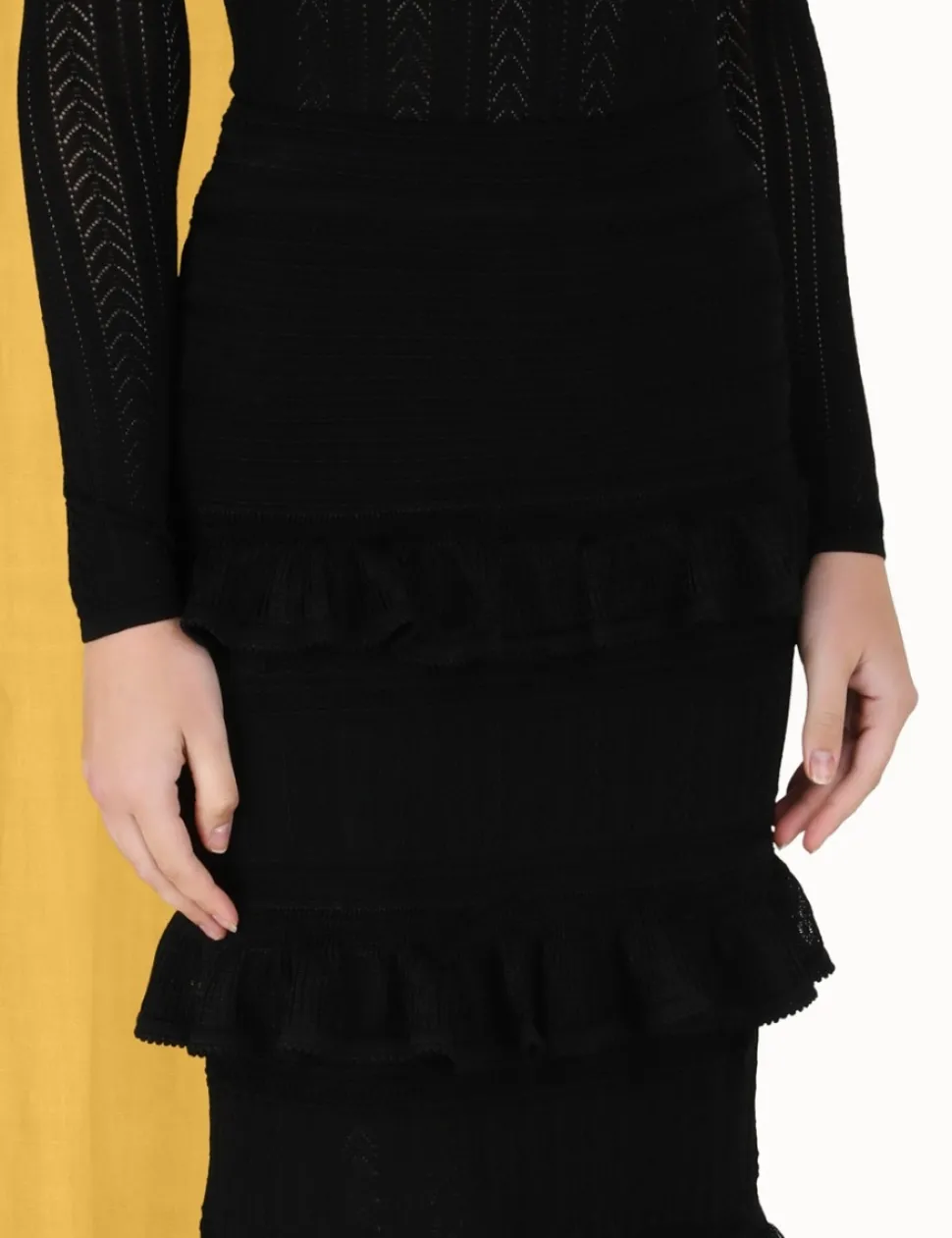 The Luminosity Ruffle Midi Skirt In Black From Our Fall 2023 Collection, Luminosity. A Knit Midi Skirt Featuring An Elastic Waistband And Tiered Ruffle Details Throughout.- Knit Skirt