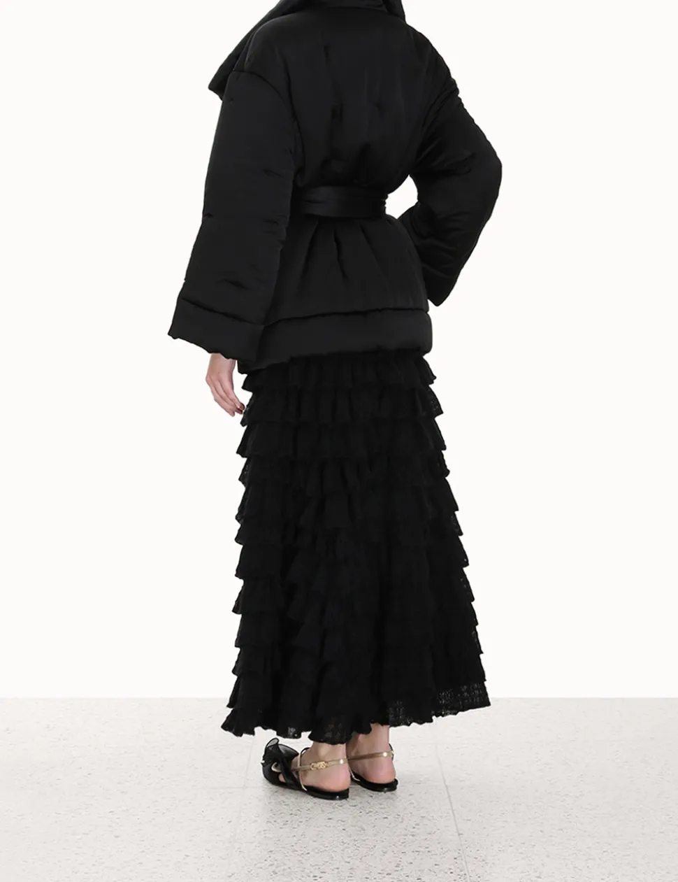 The Luminosity Satin Wadded Jacket In Black From Our Fall 2023 Collection, Luminosity. A Satin Jacket Featuring An Oversized Lapel And Self Tie Waist.- Oversized Satin Jacket