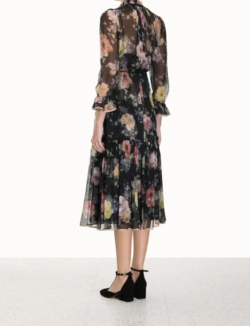 The Luminosity Tubular Midi Dress In Multi Floral Black From Our Fall 2023 Collection, Luminosity. A Silk Midi Dress Featuring Long Fluted Sleeves And Stand Collar, Finished With A Frilled Drop Hem.- Silk Midi Dress