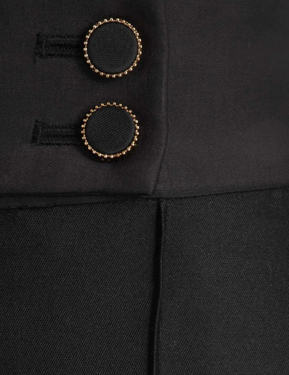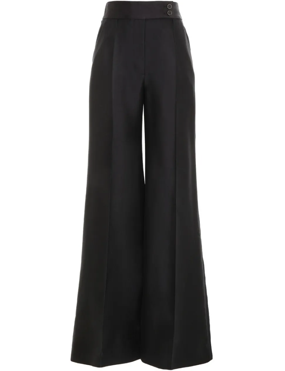 The Luminosity Tuxedo Pant In Black From Our Fall 2023 Collection, Luminosity. A Wide Leg Pant Constructed From A Wool Silk Blend, With Angled Pockets And Button Detailing Along The Waistband .- Wool Silk High Waisted Pant