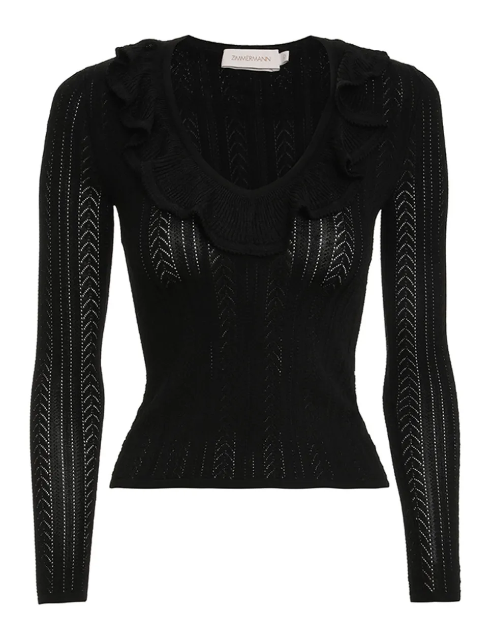 The Luminosity V-Neck Ruffle Top In Black From Our Fall 2023 Collection, Luminosity. A Knitted Long Sleeve Top Featuring A V Neckline And Ruffled Detailing Throughout.- Knitted Top