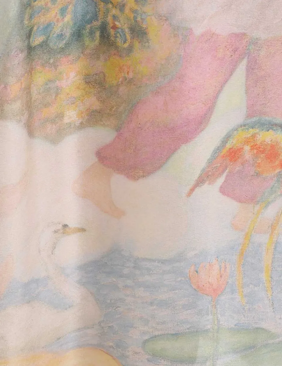 The Lyrical Barrel Mini Dress In Paradise Print From Our Fall 2023 Collection, Luminosity. A Silk Satin Mini Dress Featuring Exaggerated Sleeves And A Statement Neck Tie.- Silk Satin Chiffon