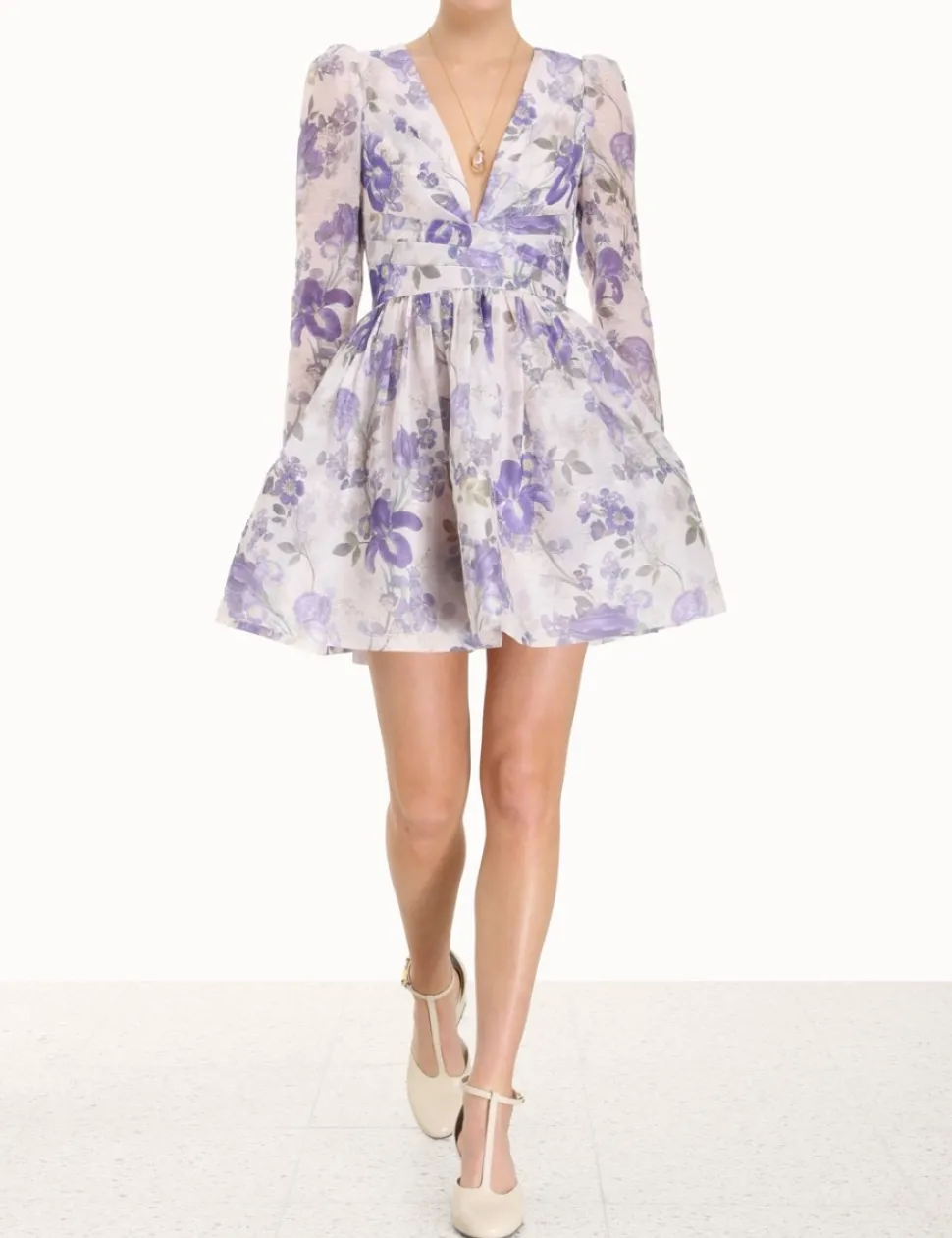 The Lyrical Cross Over Mini In Blue Iris Cream From Our Fall 2023 Collection, Luminosity. A Silk Linen Mini Dress Featuring A Gathered Bodice And Full Skirt With A Crinoline Tape Hem.- Silk Linen Mini Dress