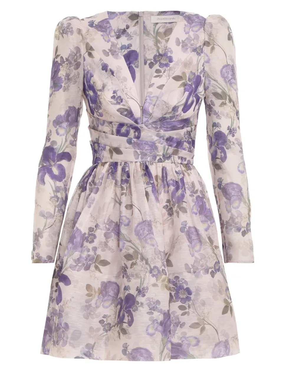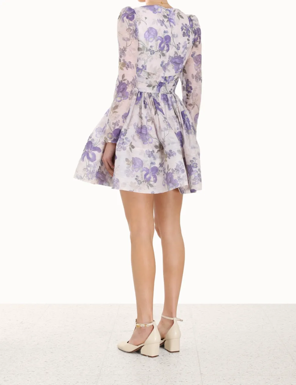 The Lyrical Cross Over Mini In Blue Iris Cream From Our Fall 2023 Collection, Luminosity. A Silk Linen Mini Dress Featuring A Gathered Bodice And Full Skirt With A Crinoline Tape Hem.- Silk Linen Mini Dress