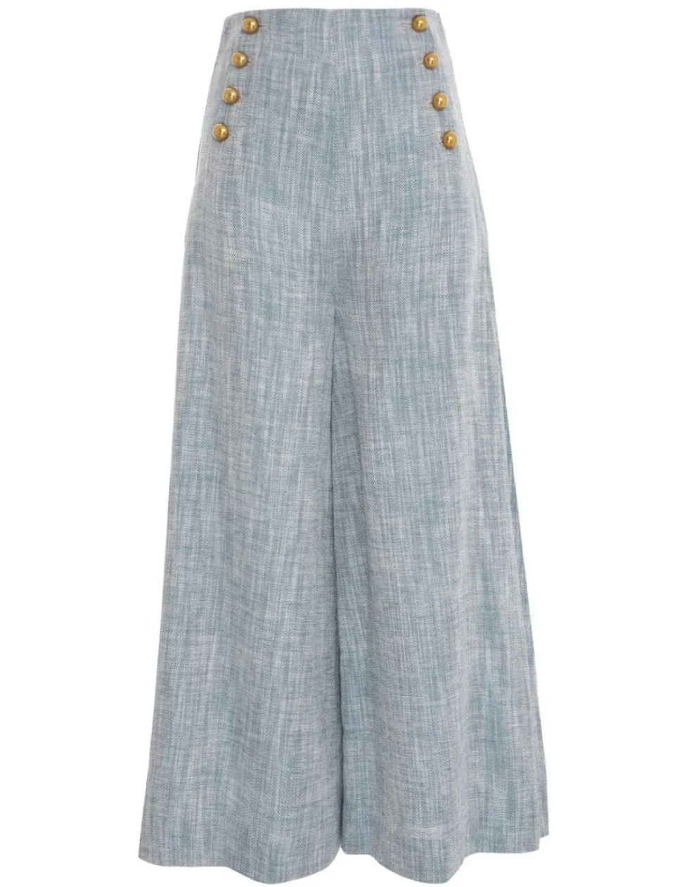 The Lyrical Culotte In Blue/Cream From Our Fall 2023 Collection, Luminosity. A Linen Blend Culotte Pant Featuring A High Rise, Wide Leg Silhouette, Finished With Gold Buttons And Side Pockets.- Linen Cotton Blend Pant