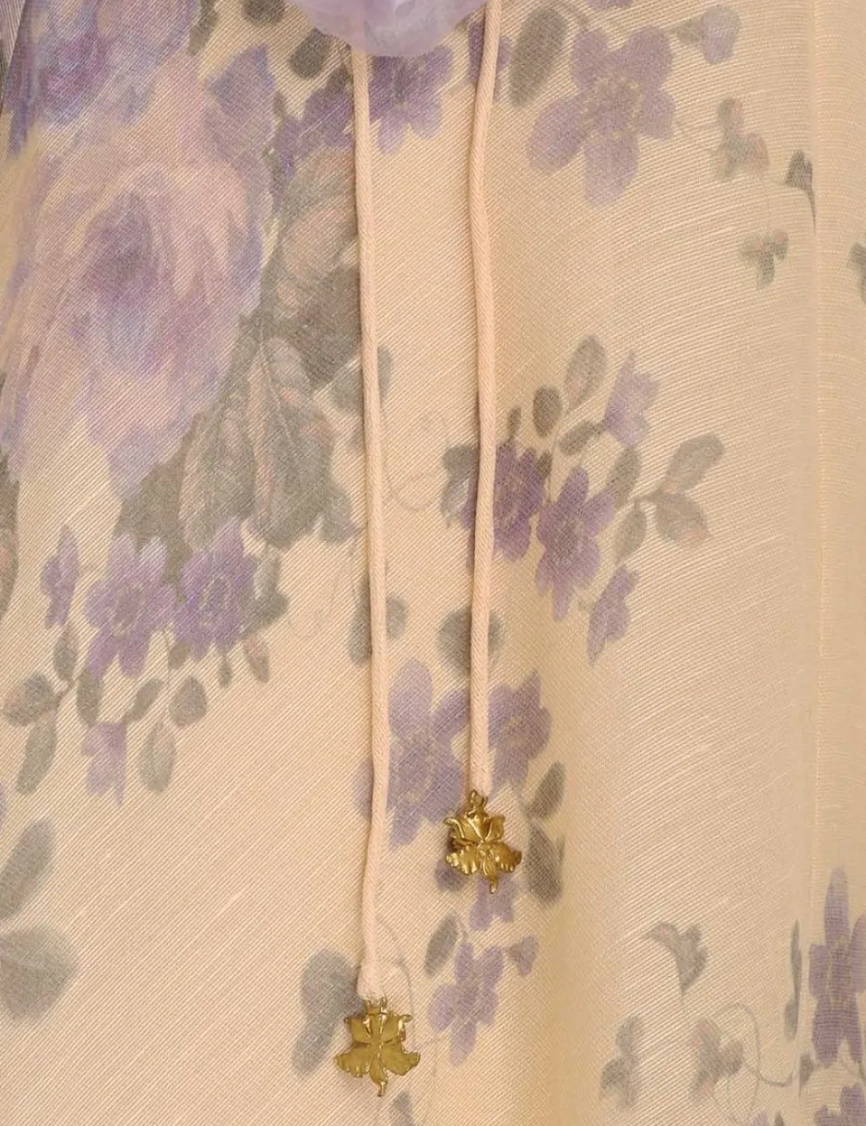 The Lyrical Flare Sleeve Midi In Blue Floral Print From Our Fall 2023 Collection, Luminosity. A Silk Linen Organza Midi Dress Featuring Cropped Sleeves With Fluted Ends And A Waist Tie With A 3D Flower Applique.- Silk Linen Organza Midi Dress