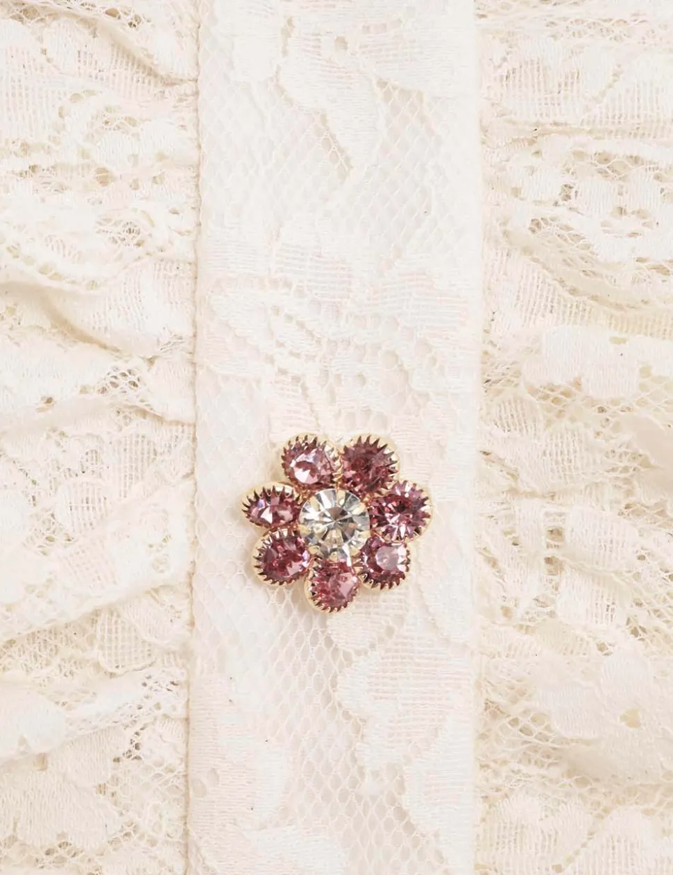 The Lyrical Lace Blouse In Cream From Our Fall 2023 Collection, Luminosity. A Long Sleeve Lace Blouse Featuring A Double Layered Lace Placket And Flower Crystal Buttons.- Lace Long Sleeve Blouse