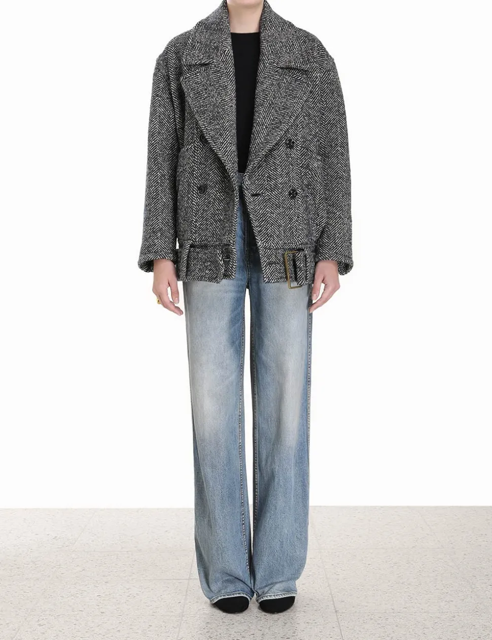 The Lyrical Oversized Biker Jacket In Deep Navy From Our Fall 2023 Collection, Luminosity. A Wool Blend Jacket Featuring An Oversized Biker Silhouette And Gold Hardware Throughout.- Oversized Biker Jacket